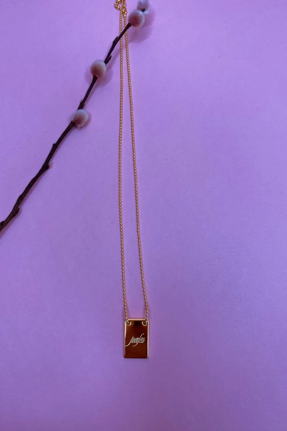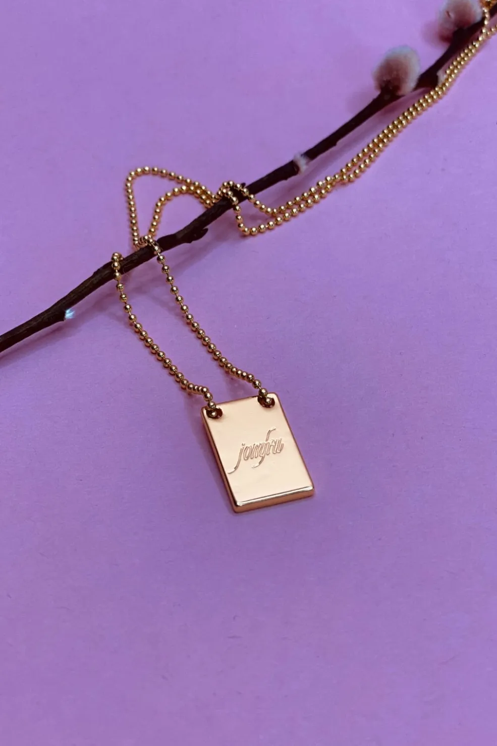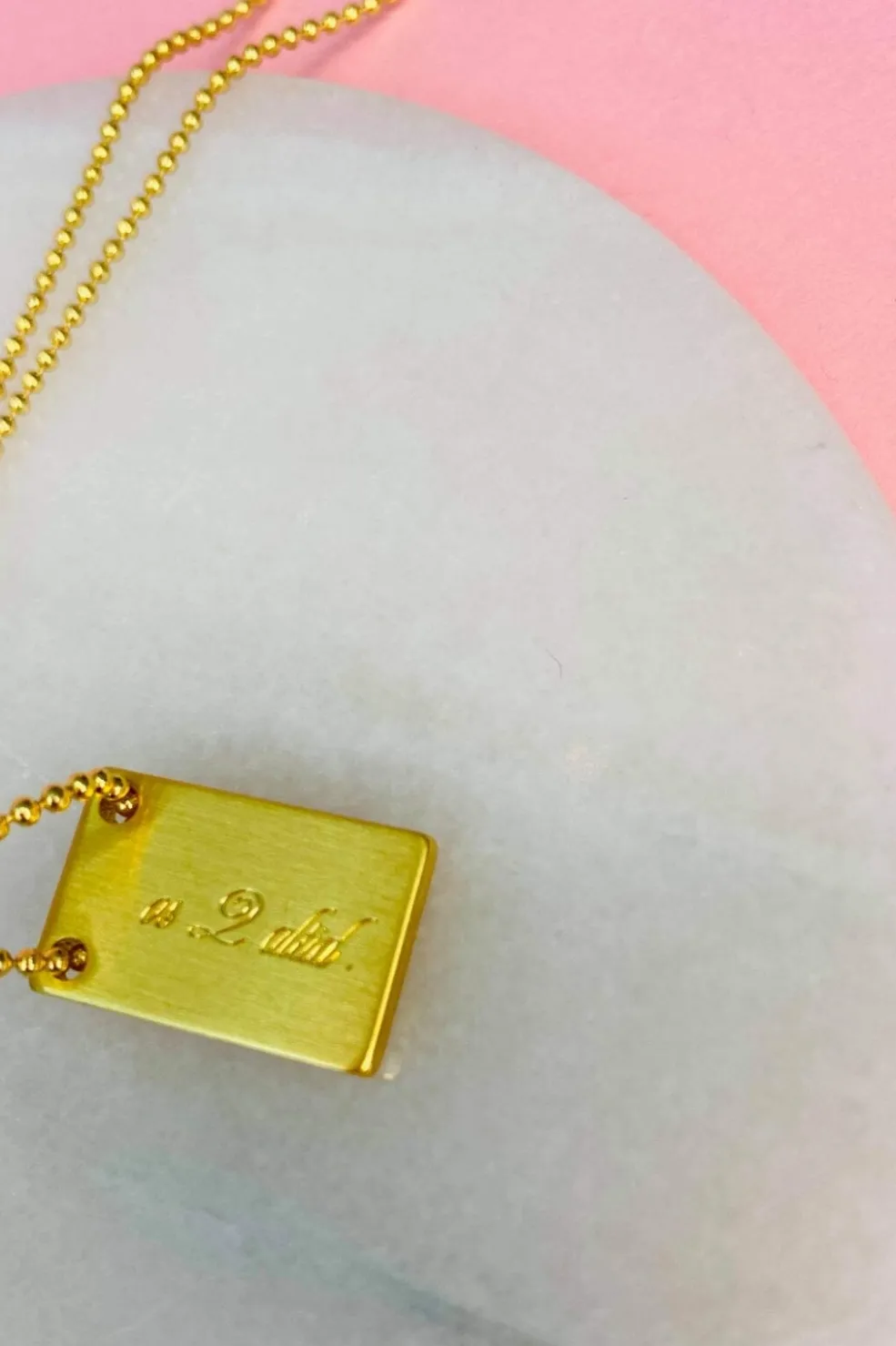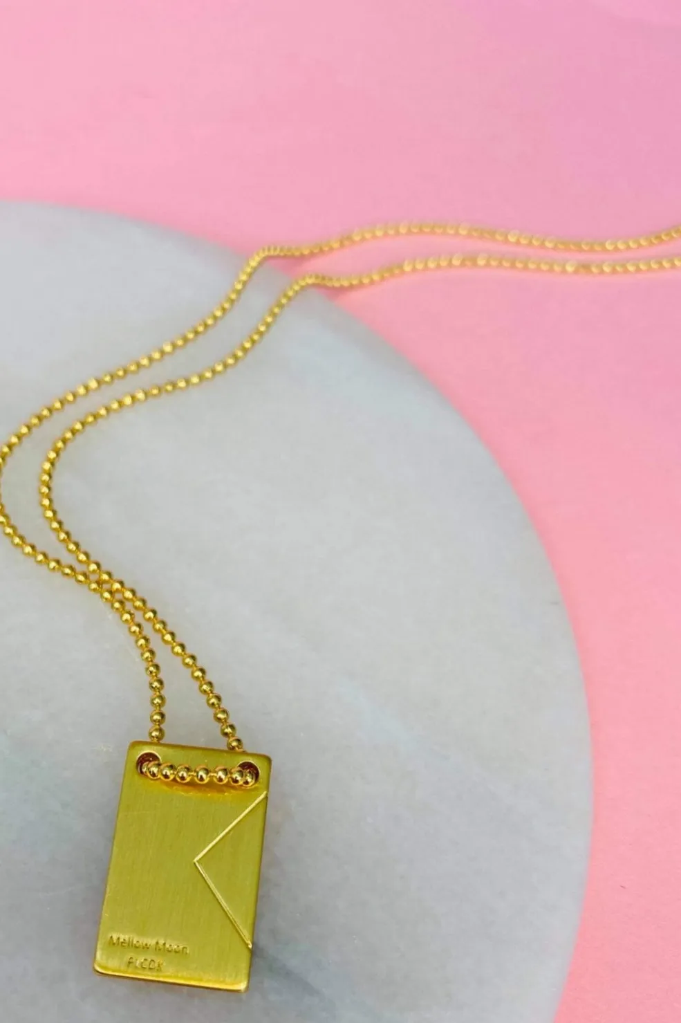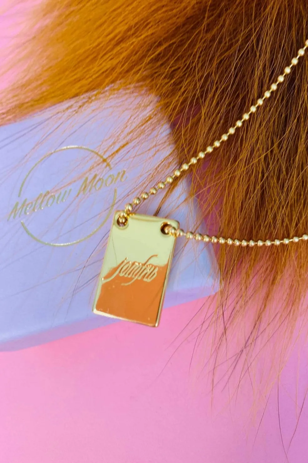 Forgyldt halskæde fra Mellow Moon med indgraveret stjernetegn på en gylden plade. Kæden har justerbar længde og kommer i en præsentationsæske.