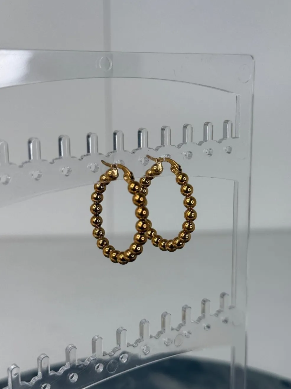 Forgyldte øreringe fra Mellow Moon med cirkulær form. Øreringene har små kugler langs kanten, der danner en rund formation i guldfarvet finish.