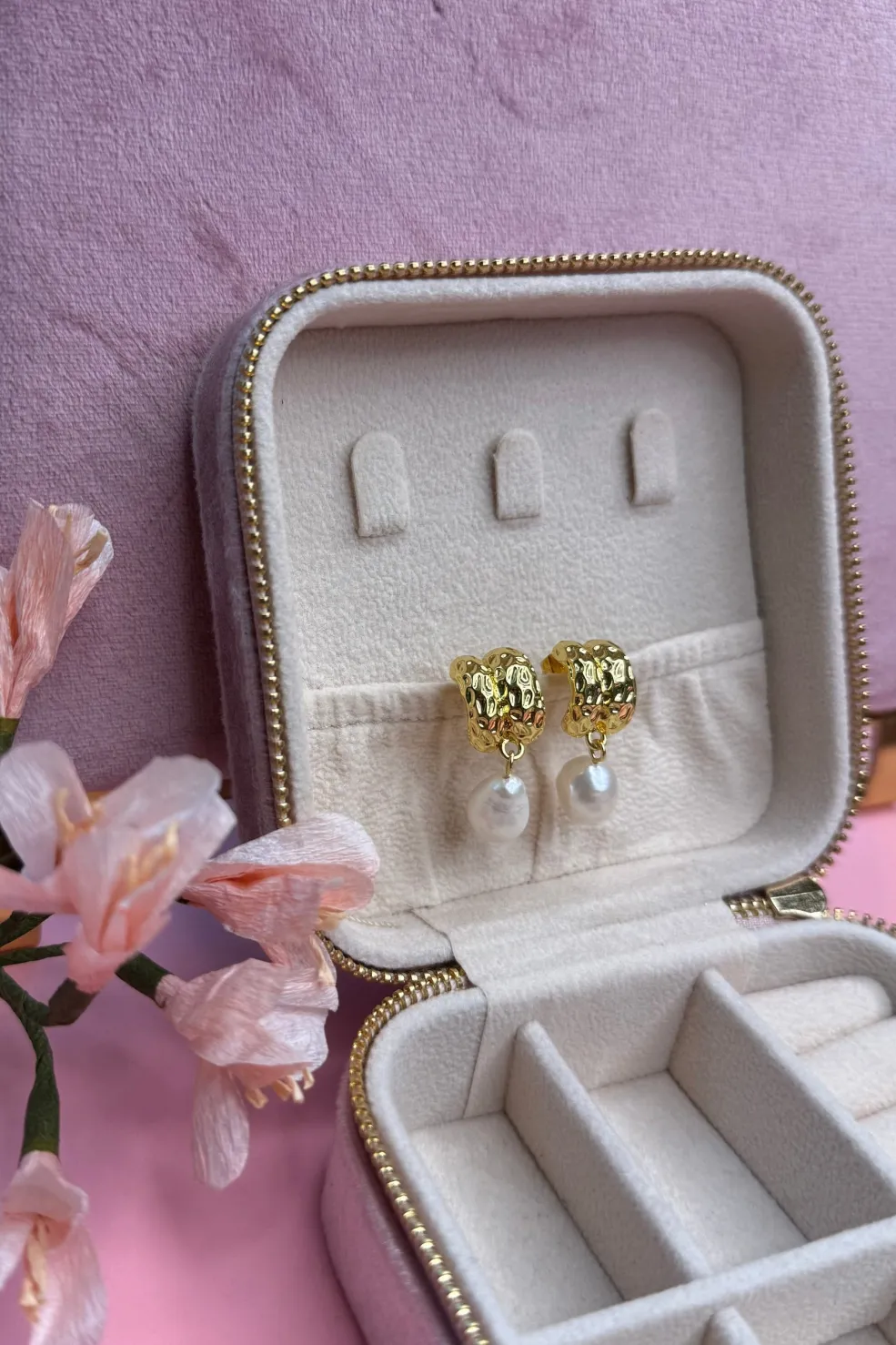 Forgyldte øreringe fra Mellow Moon med en struktureret overflade og hvide perler. Øreringene har en rund form med et mønstret design, der fremhæves af perlerne.