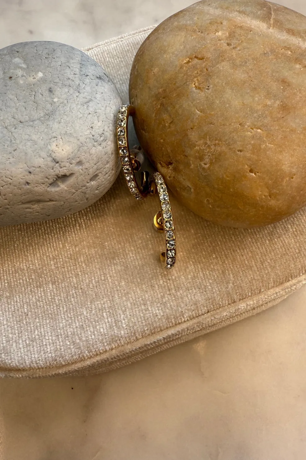 Øreringe fra Mellow Moon i gylden farve med små funklende sten langs den ydre kant. Designet har en buet form.
