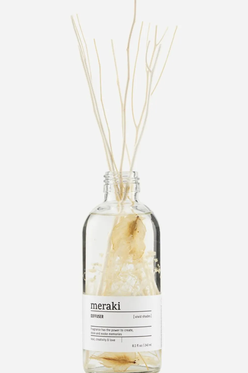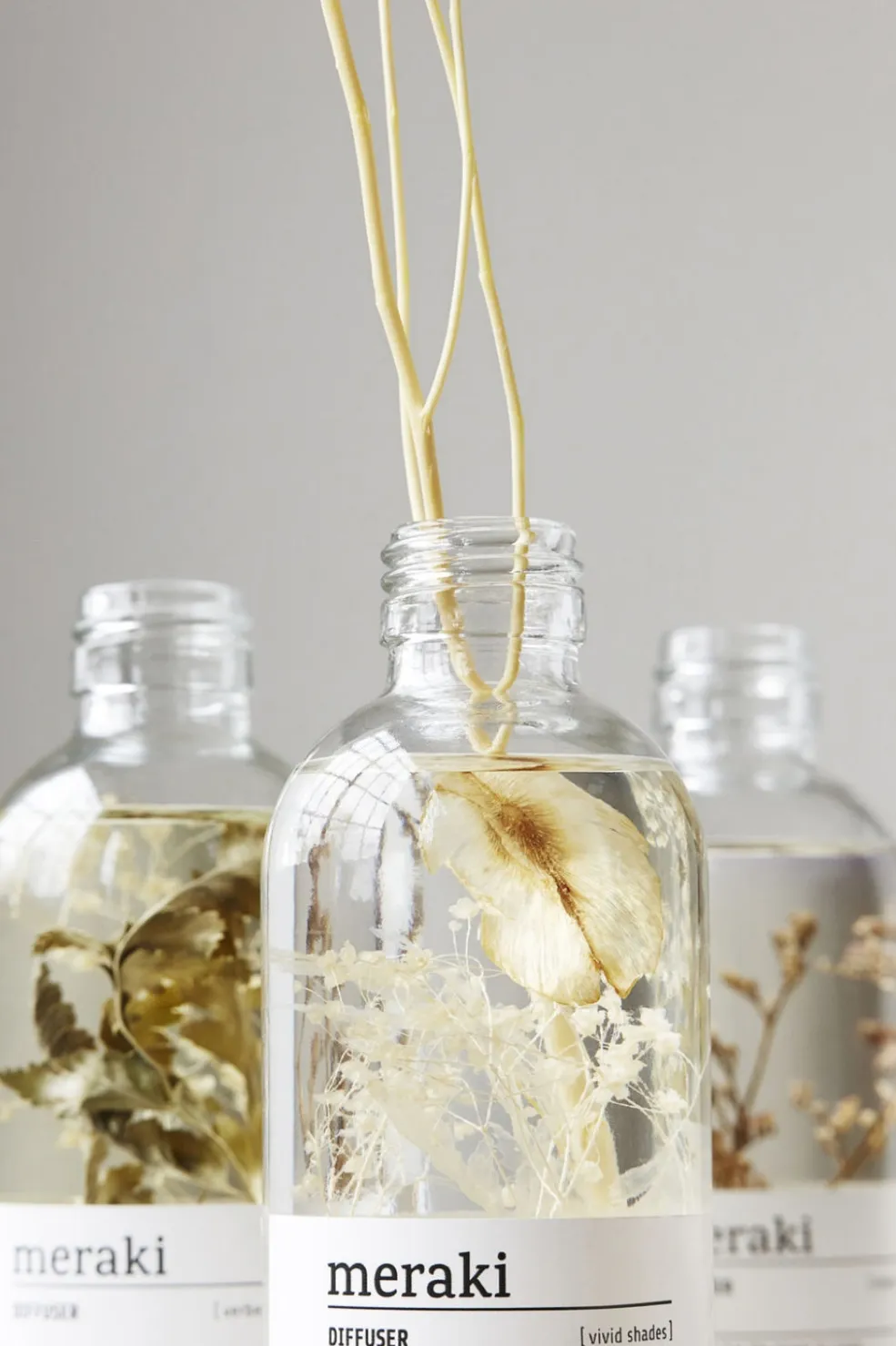 En duftfrisker fra Meraki med tørrede blomster og træpinde i en klar glasflaske. Flasken indeholder 240 ml duftende væske med friske og blomstrede noter.