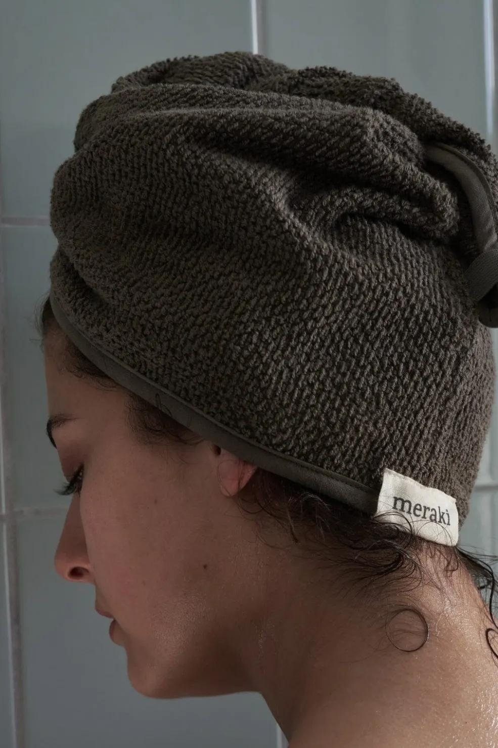 Et hårhåndklæde i mørkegrøn med frotté på begge sider. Den blødgørende effekt gør håndklædet skånsomt mod håret under tørring.