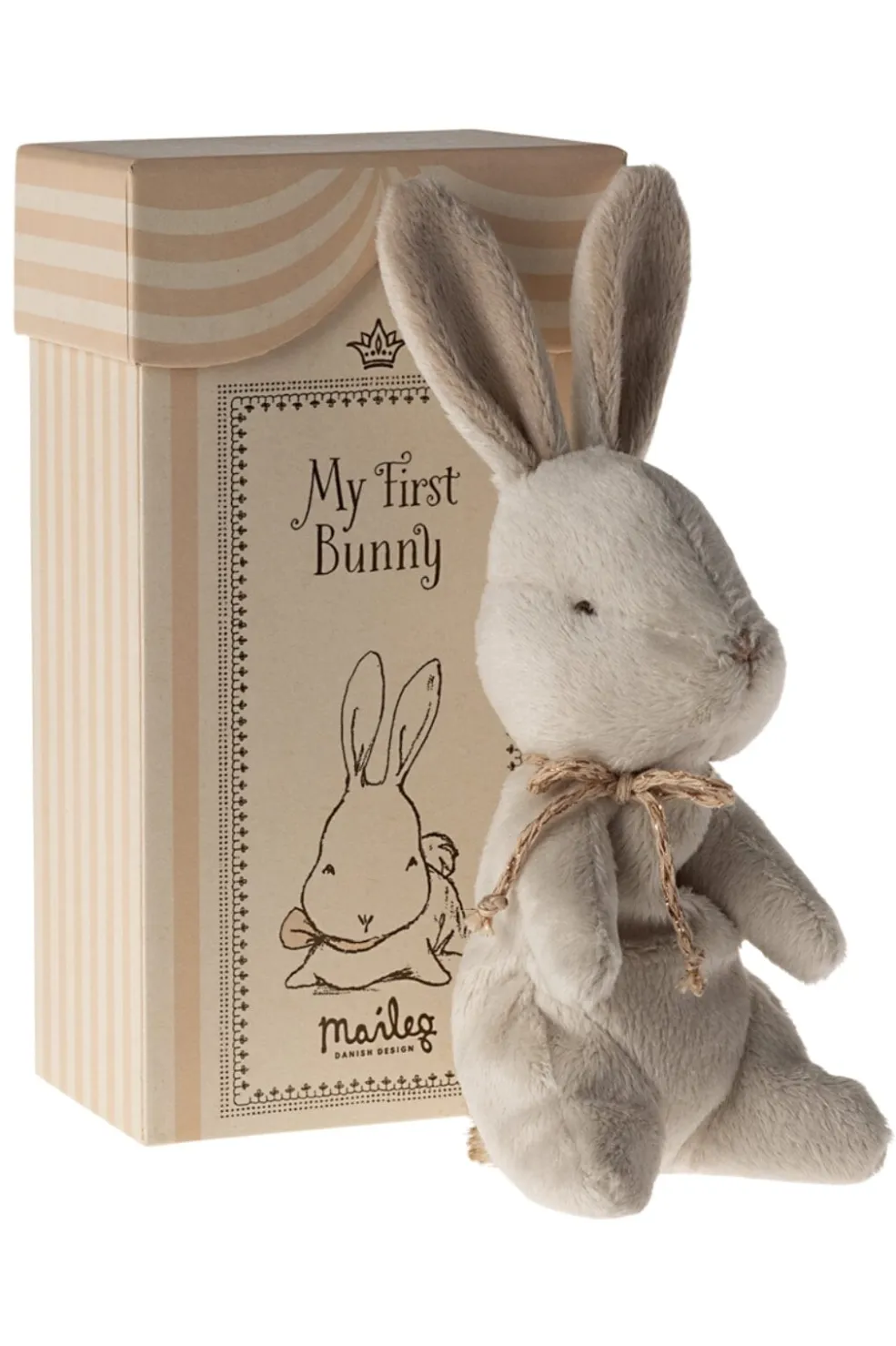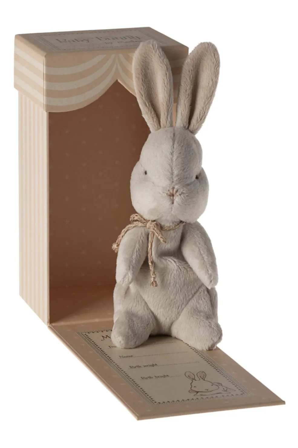Råhvid bamsekanin fra Maileg i blødt plys med et bånd om halsen. Leveres i en gaveæske med plads til at notere fødselsoplysninger.