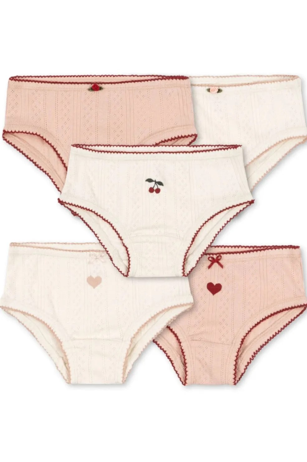 5-pak underbukser fra Konges Sløjd i lyserød og hvid. Underbukserne har fine detaljer som hjerter, kirsebær og sløjfer, og de kommer med forskellige mønstre i hver pakke.