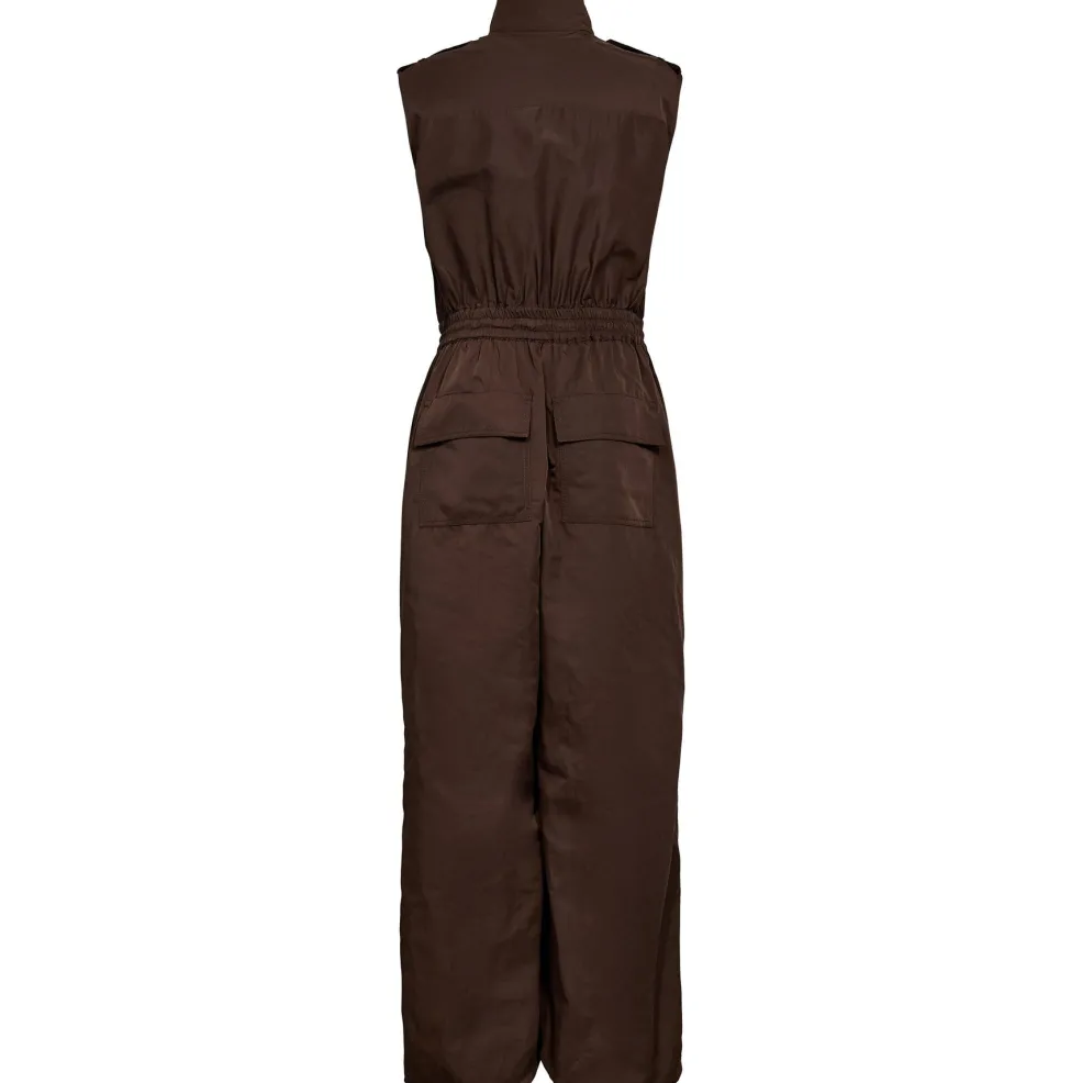 En brun jumpsuit fra Gossia i 100 % polyester. Jumpsuiten er uden ærmer og har en længde ned til læggen.
