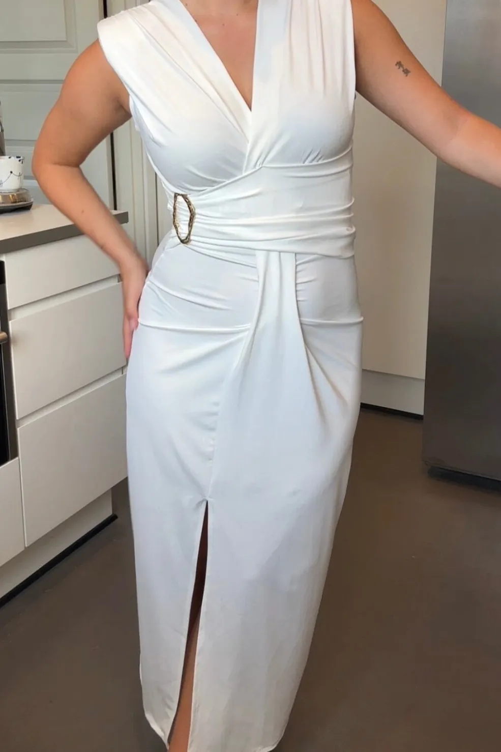 Hvid kjole fra A-bee. Den er lavet af polyester og passer til bryllupper, formelle begivenheder og festlige sammenkomster.