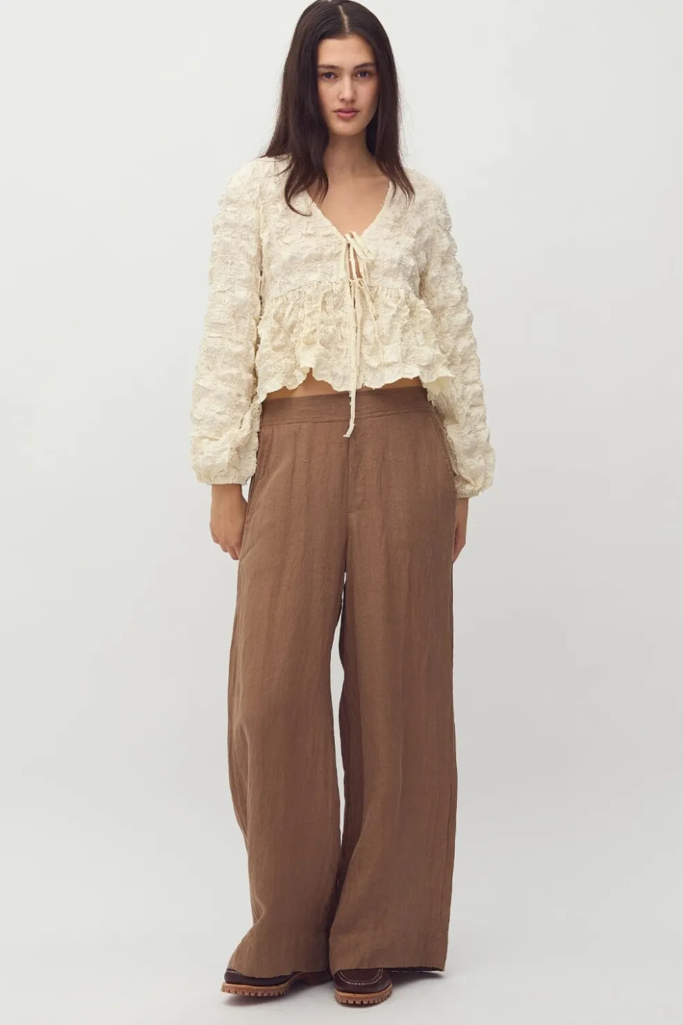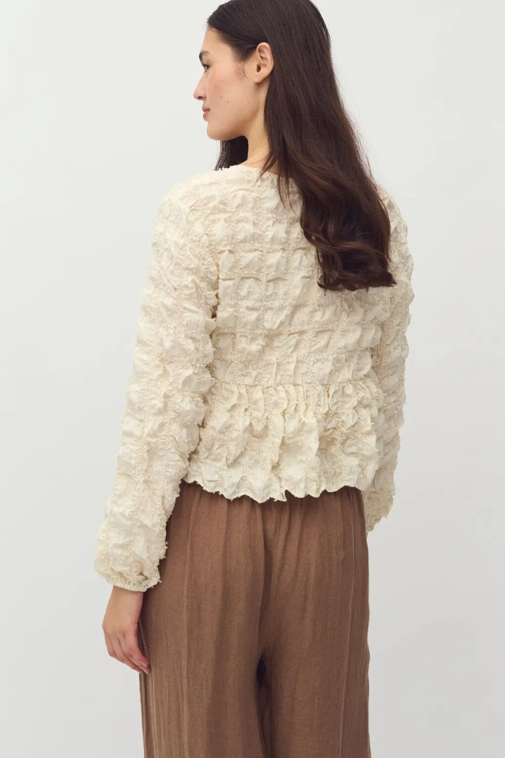 Bluse fra MbyM i en cremehvid oyster-nuance. Den har rynkedetaljer over det hele og bindebånd ved V-udskæringen. De lange ærmer har flæser, der giver blusen struktur.