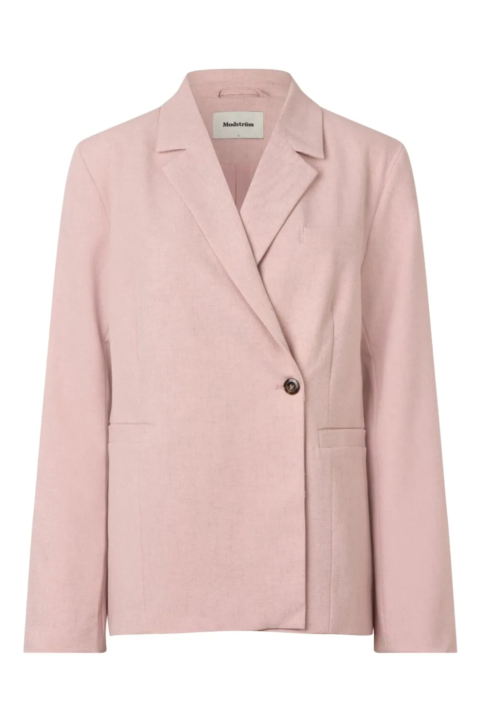 Blazer fra Modström i en lys pink melange-farve med skjortekrave. Den har lange ærmer og lukkes med knapper foran. Blazeren har to frontlommer og en regulær pasform.