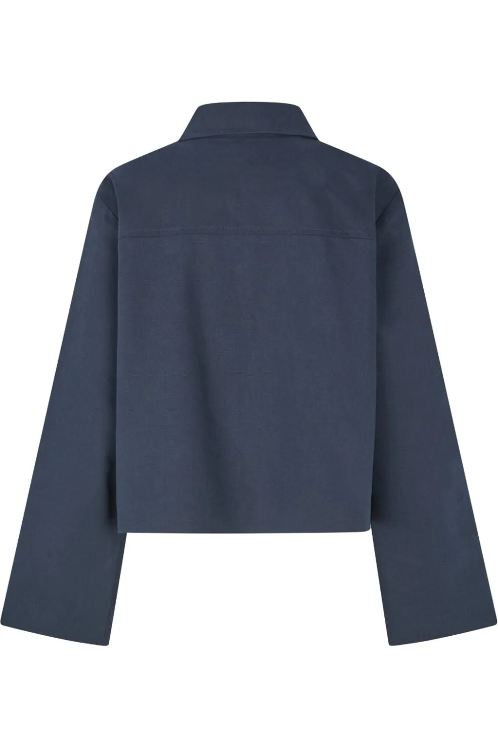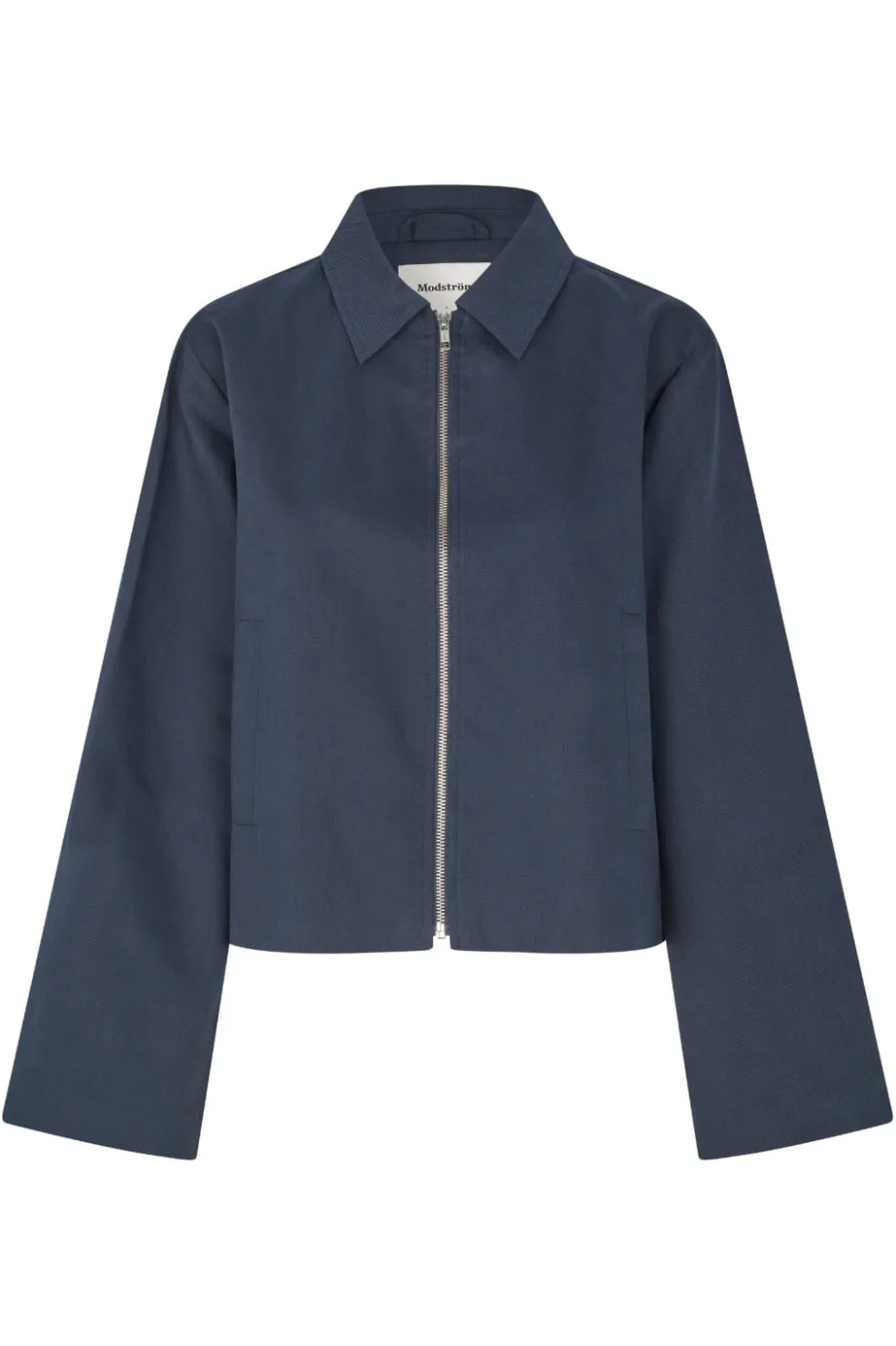 Mørkeblå jakke fra Modström med kort længde og skjortekrave. Jakken har en løs pasform med brede ærmer og lynlåslukning foran.