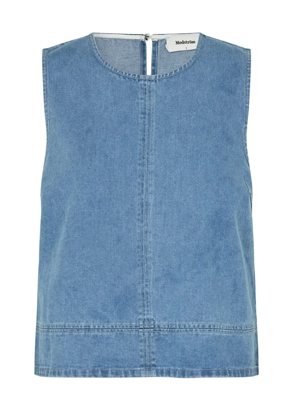 Ærmeløs denimtop fra Modström i vintage blå. Toppen har en rund hals og knaplukning i nakken. Den løse pasform giver god bevægelsesfrihed.