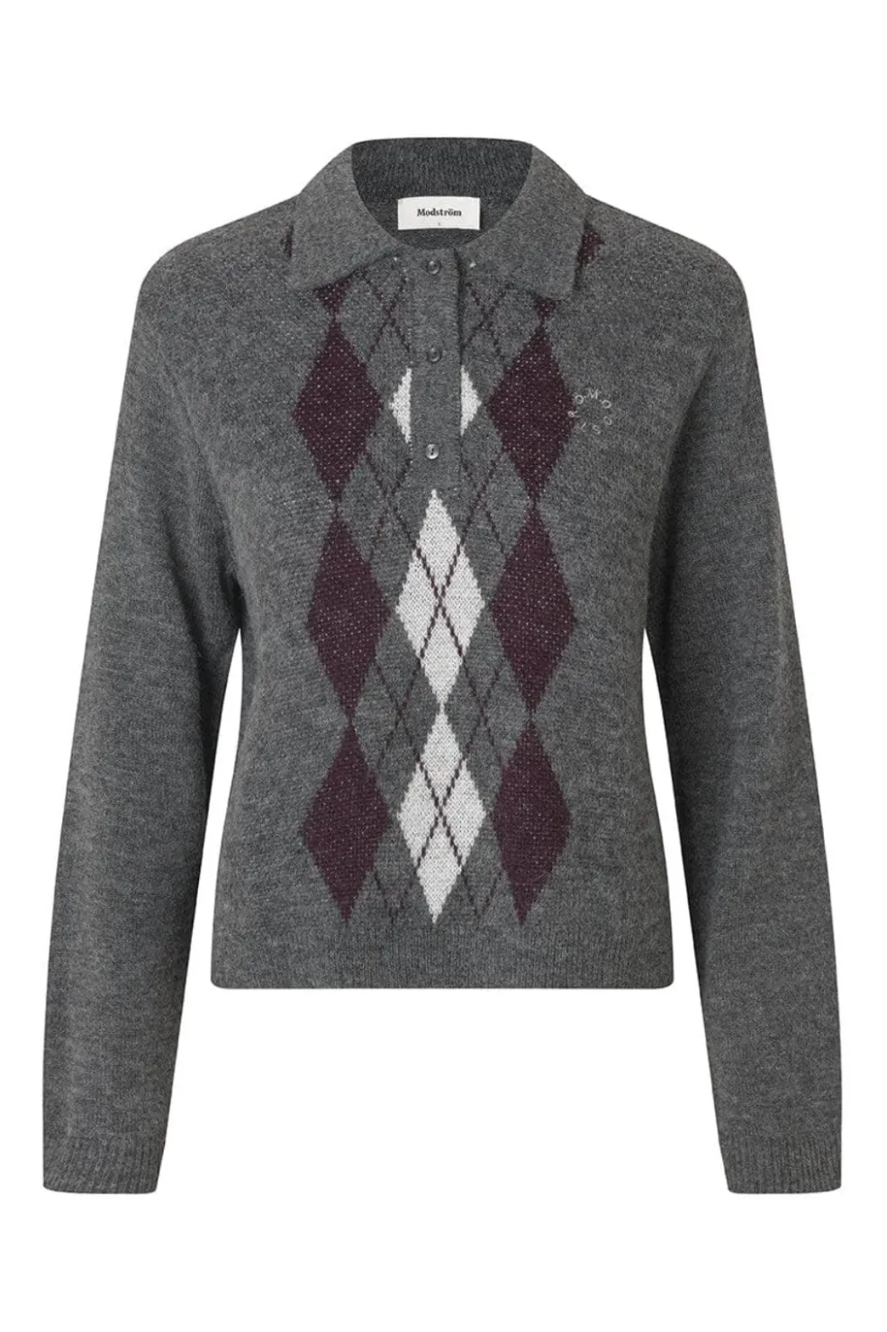 Grå polo fra Modström med et klassisk rudemønster i grå og bordeaux nuancer. Den har polokrave med knaplukning, lange ærmer og broderede detaljer på forsiden.