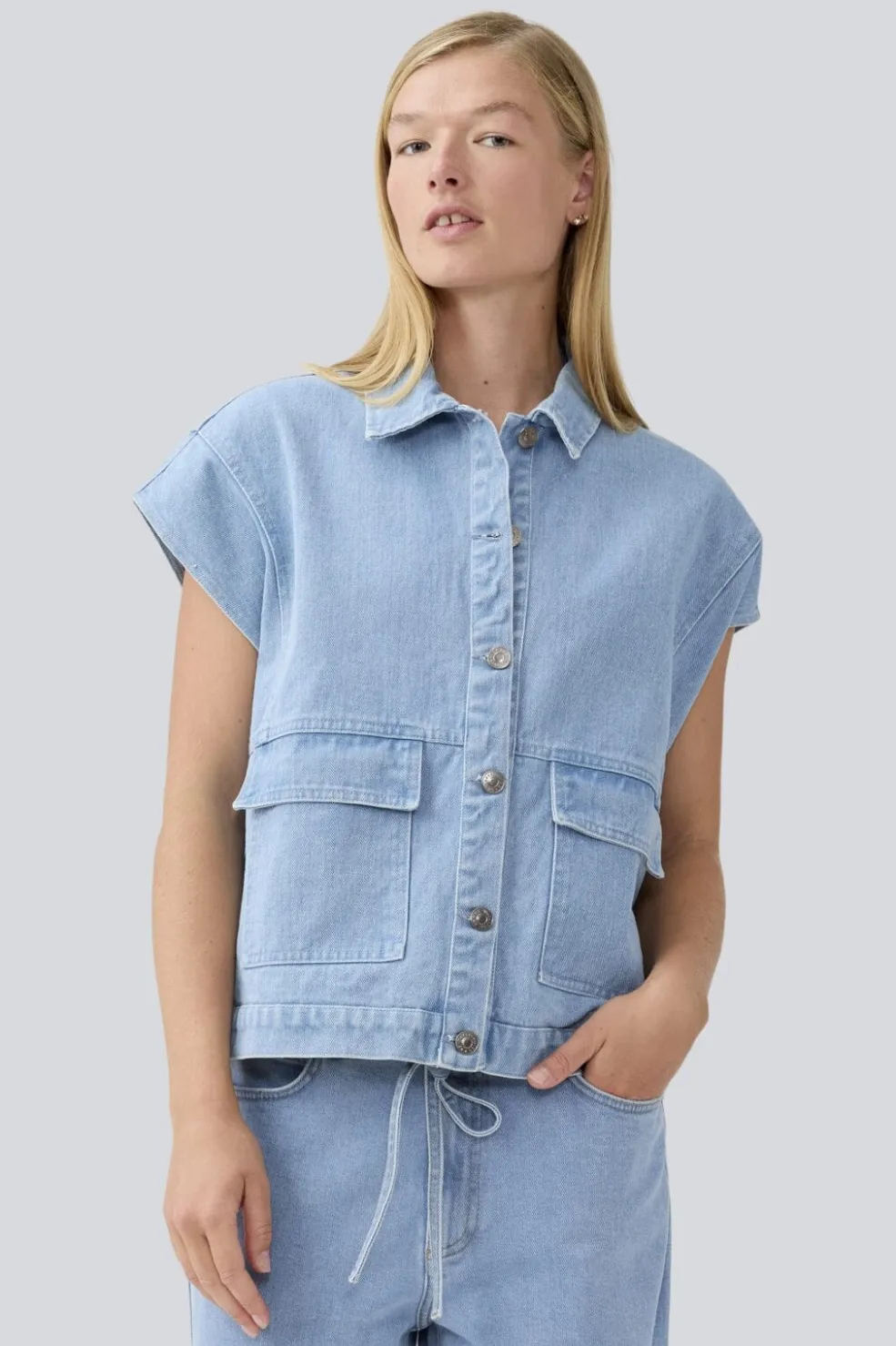 Denimblå vest fra Modström med skjortekrave og knaplukning. Vesten har en løs pasform og to praktiske forlommer på forsiden.