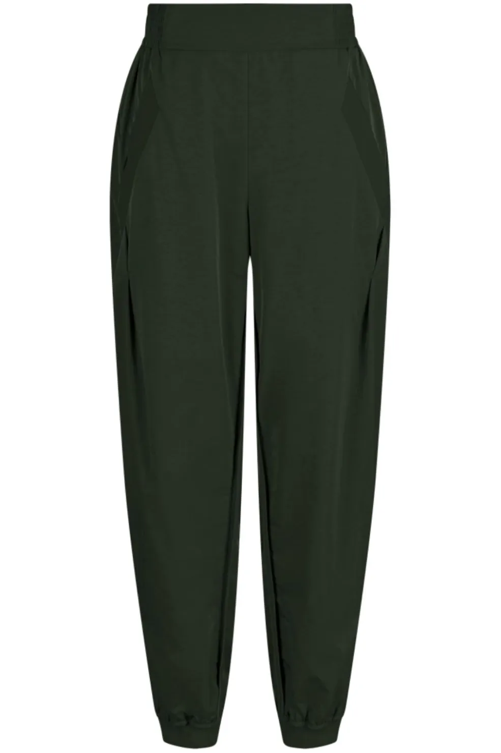 Mørkegrønne bukser fra Gossia i en blød kvalitet. Bukserne har en løs pasform med rib-liste lommer foran og smock-linning i siden og bagpå.