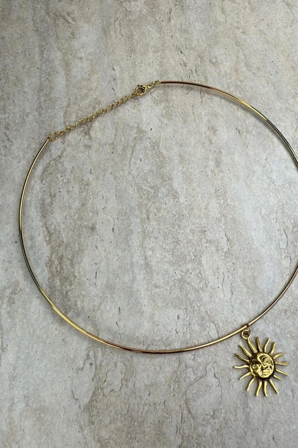 Guldfarvet halskæde fra Molly&My Jewellery med et solformet vedhæng. Halskæden har en tynd, stiv bøjle og en justerbar kæde bagpå.