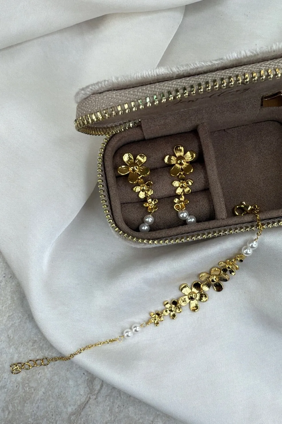 Smykker fra Molly&My Jewellery med blomsterformet design og perler. Smykkerne er lavet af rustfrit stål med en forgyldt overflade i gylden farve.
