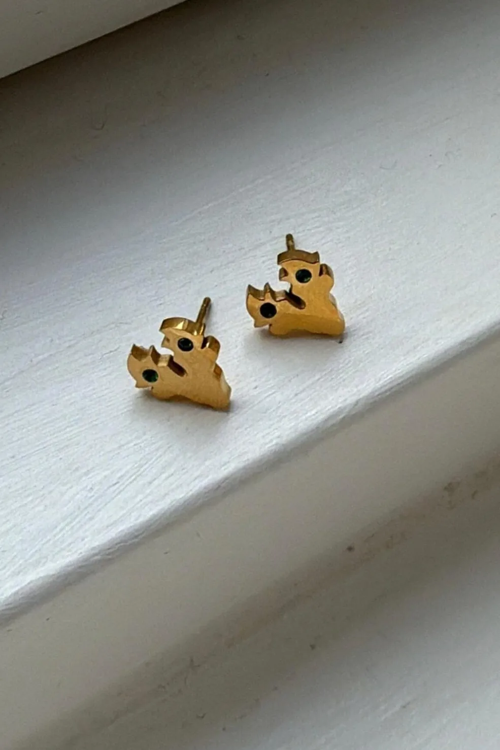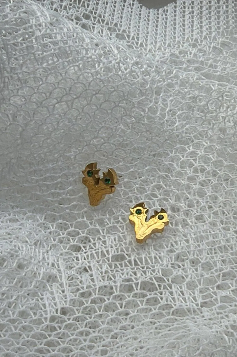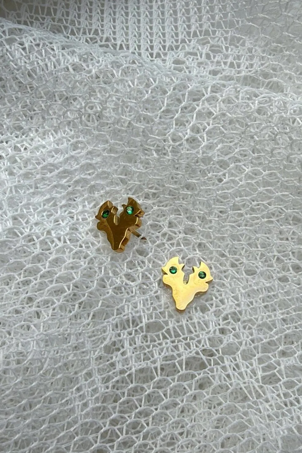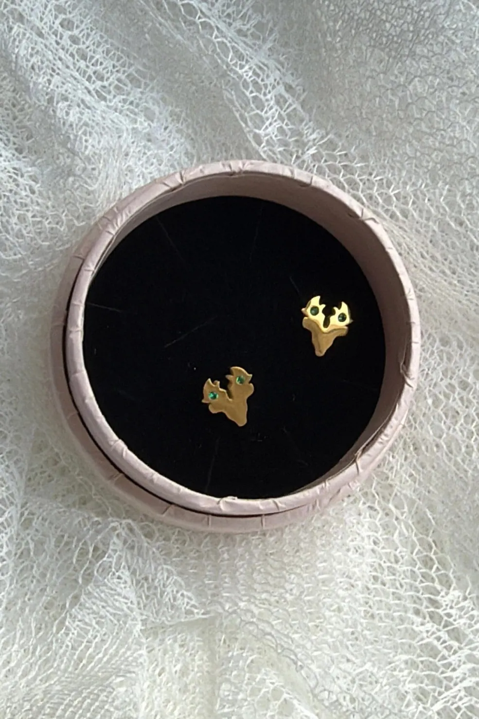 Ørestikker fra Molly&My Jewellery med et abstrakt design i en gylden finish. Små grønne sten er indsat i hver ørestik.