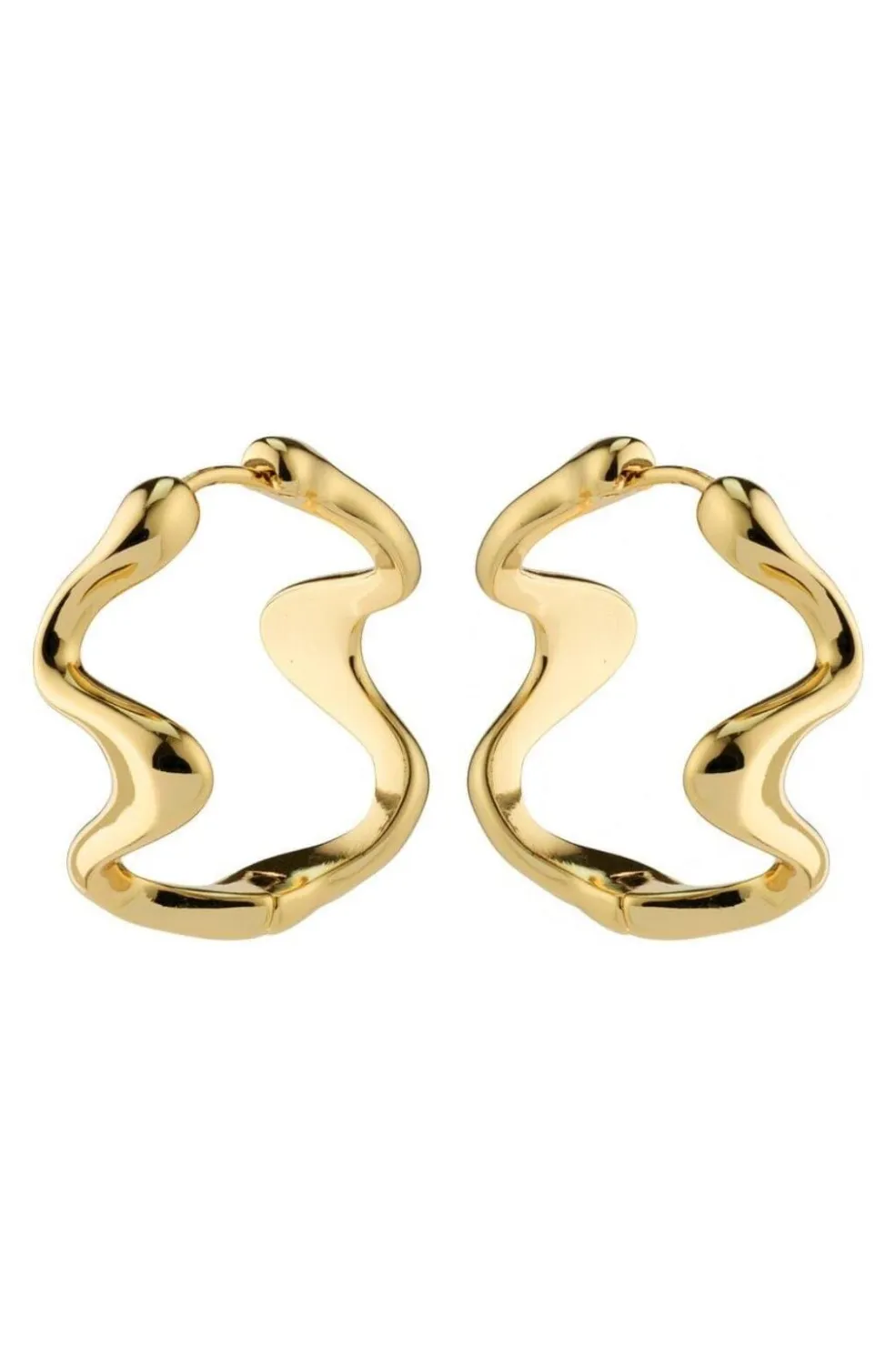 Gyldne øreringe fra Pilgrim med et bølget, skulpturelt design. Øreringene er fremstillet af genanvendt messing med en blank guldbelægning, der fremhæver det organiske formsprog.