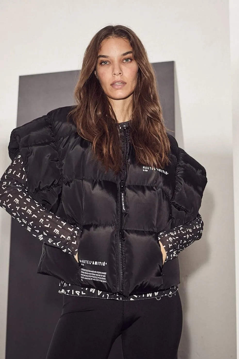 Sort puffer vest fra Haute L’Amitié med quiltet mønster. Vesten har høj hals og rynker, der giver et stilfuldt udtryk.
