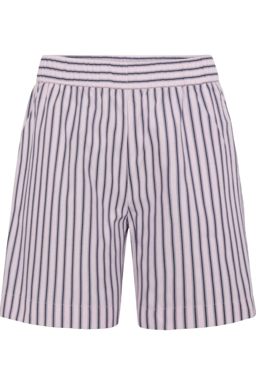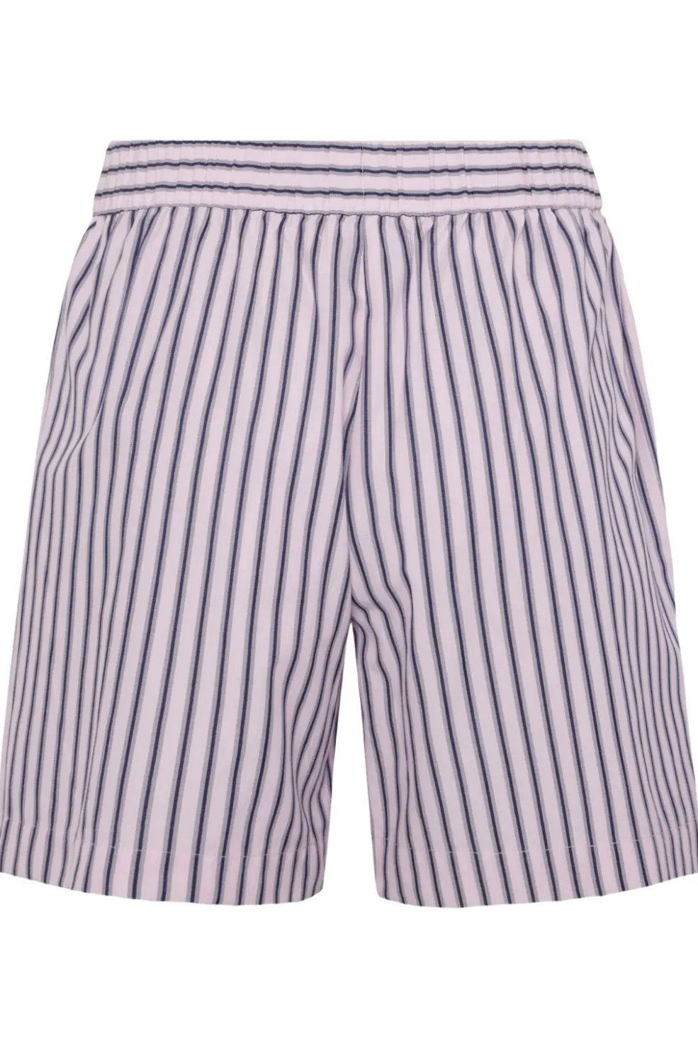 Stribede shorts fra Moves by Minimum i pink med marineblå striber. De har en regular fit og en elastisk talje, der gør dem nemme at style til både hverdag og fest.