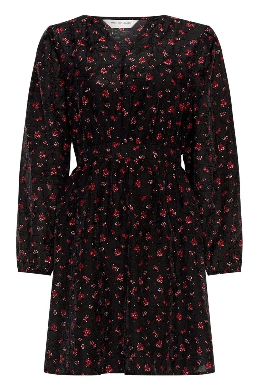 Sort kjole fra Moss Copenhagen med blomsterprint i røde nuancer. Kjolen har lange ærmer og en V-hals.