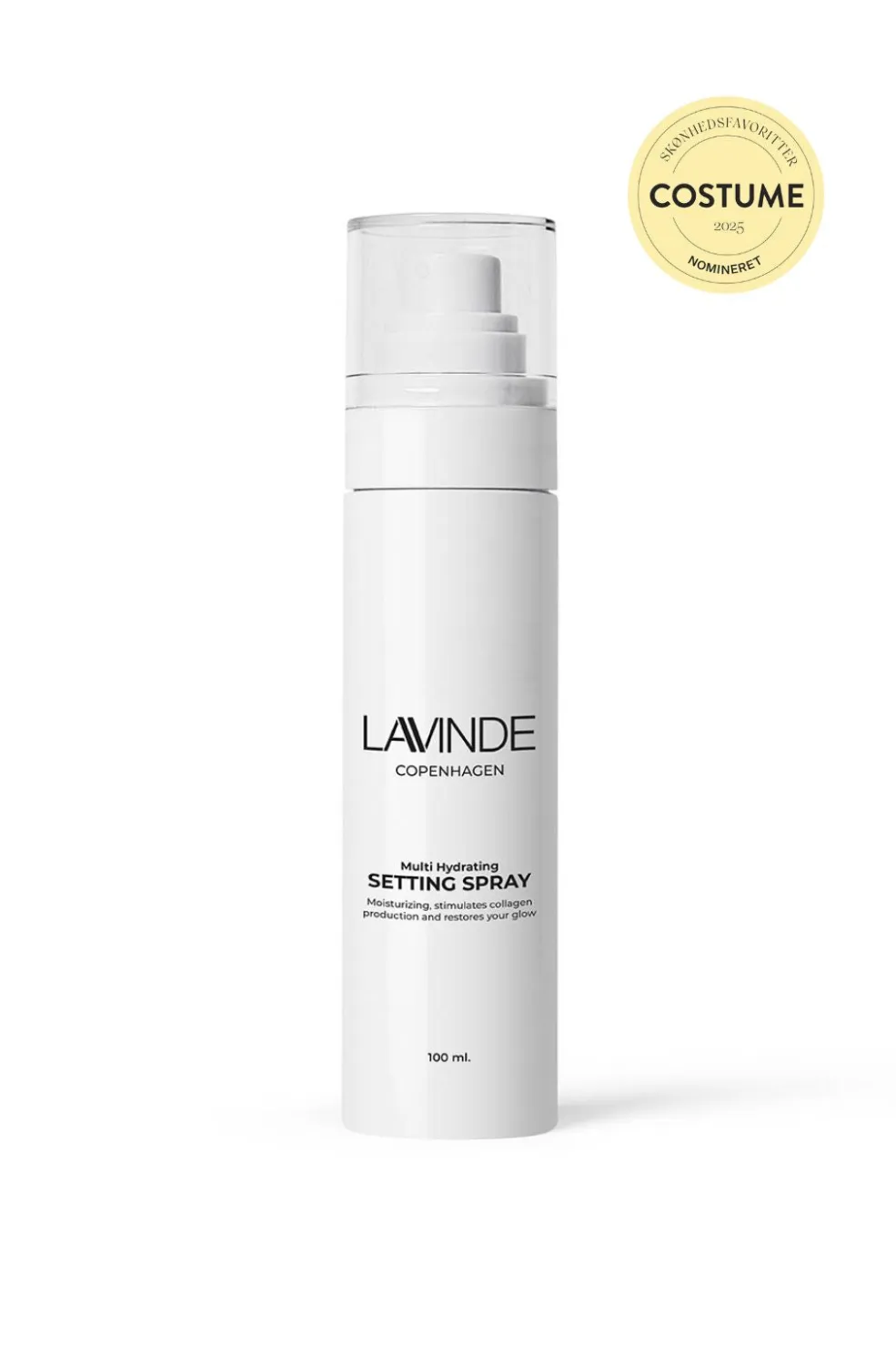 En fugtgivende setting spray fra Lavinde Copenhagen med aloe vera og agurkeekstrakt. Sprayen kan bruges både før og efter makeup.