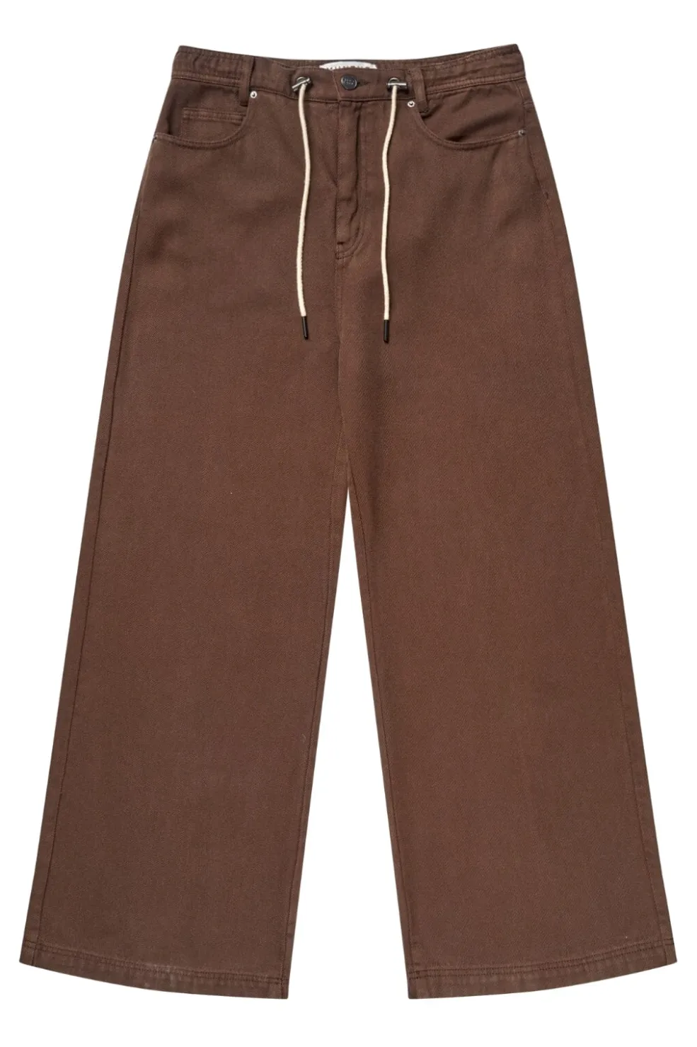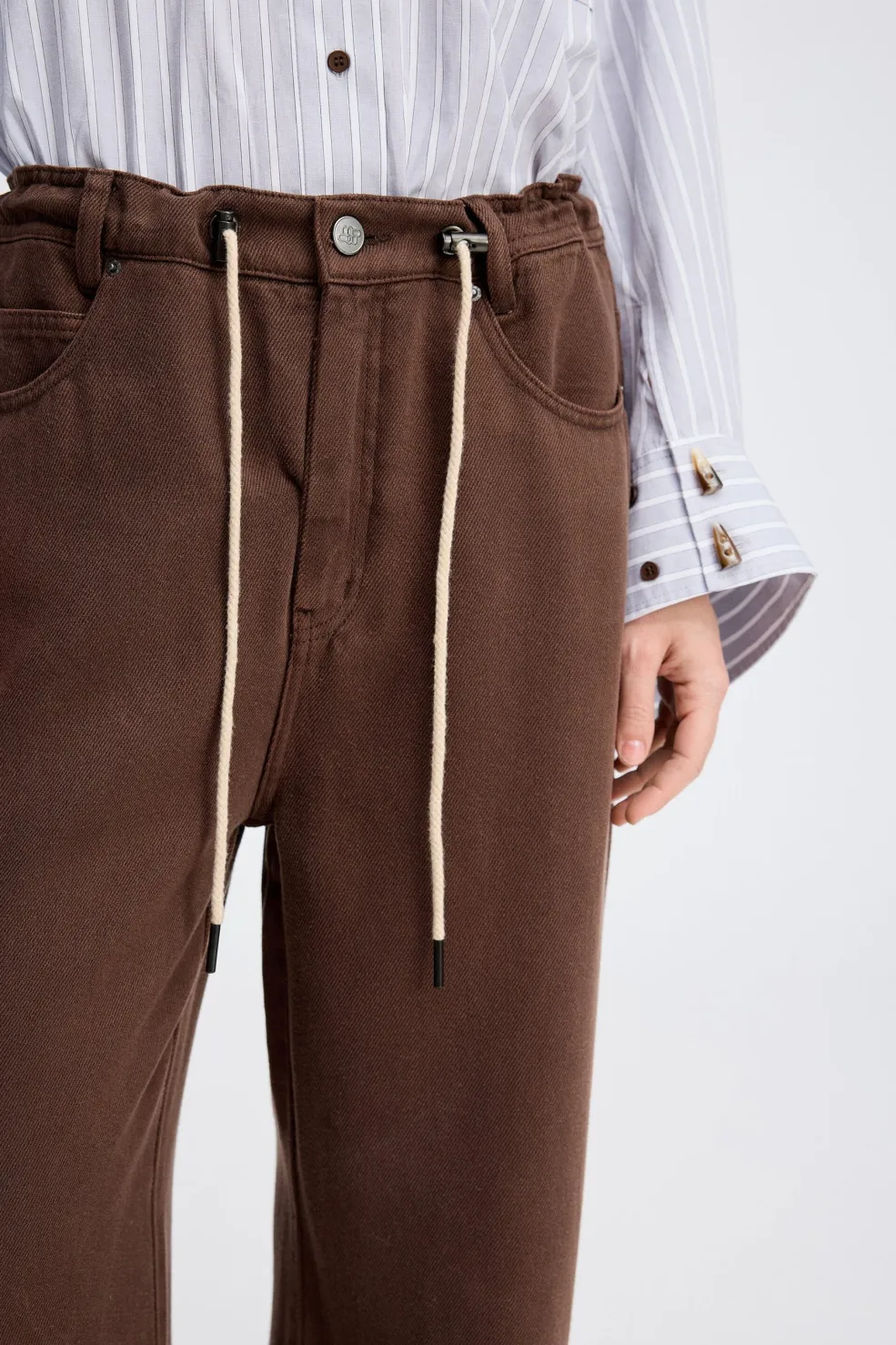 Brune bukser fra Munthe i blødt Lyocell med høj talje. De har en løs pasform med brede ben og snøredetalje i taljen. Bukserne går helt ned til gulvet.