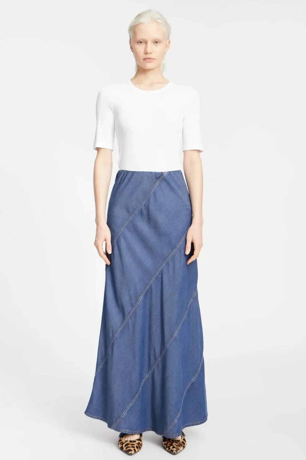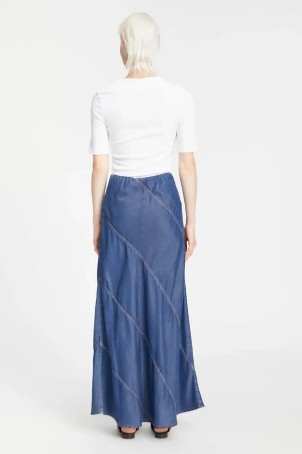Lang denimnederdel fra Munthe i indigo blå. Nederdelen har skrå syninger på hele fladen og en elastisk talje, der giver god bevægelighed.