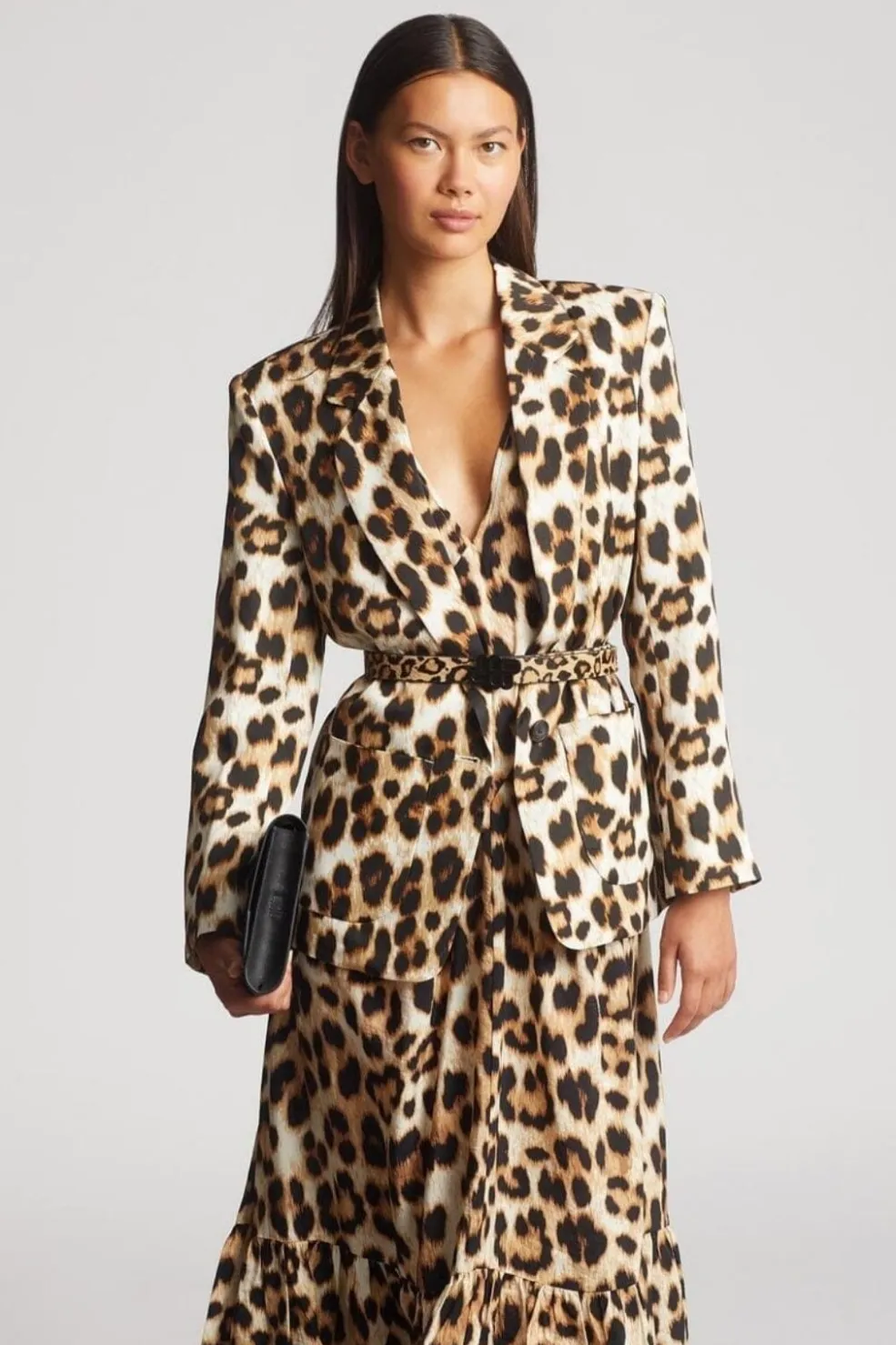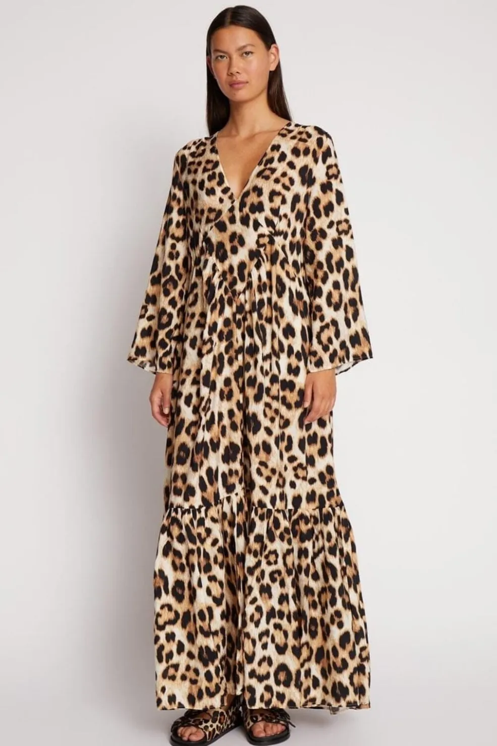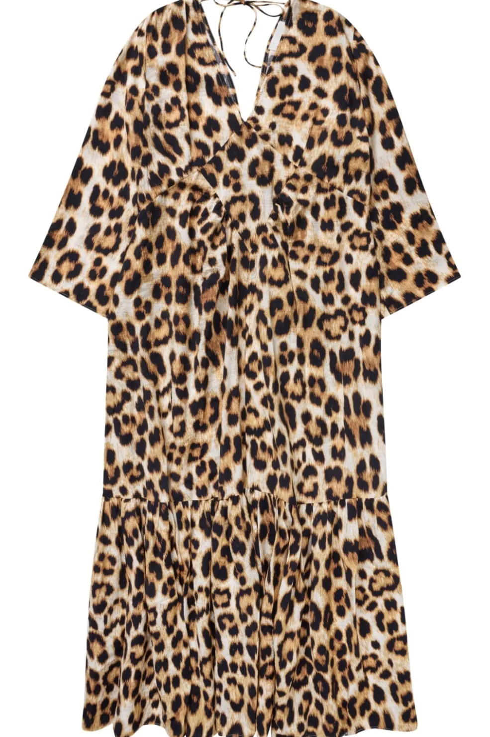 Lang kjole fra Munthe i mocca-farvet leopardprint. Kjolen har en dyb V-udskæring, bindebånd på ryggen og ruderformet syning foran.
