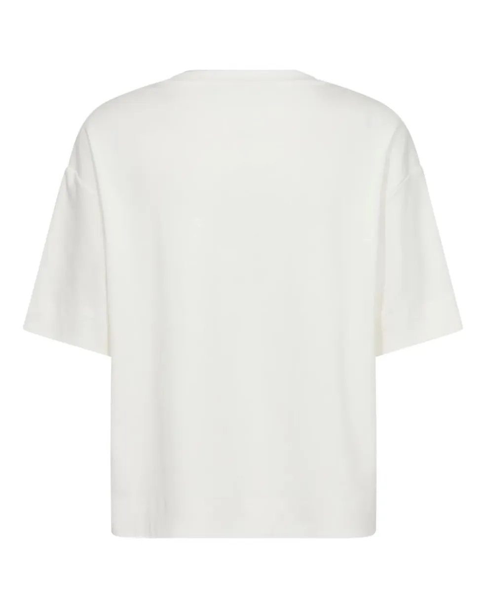 Hvid t-shirt fra Copenhagen Muse med et kunstnerisk print på forsiden. Printet viser læber og en hånd med et værktøj i en dramatisk komposition.