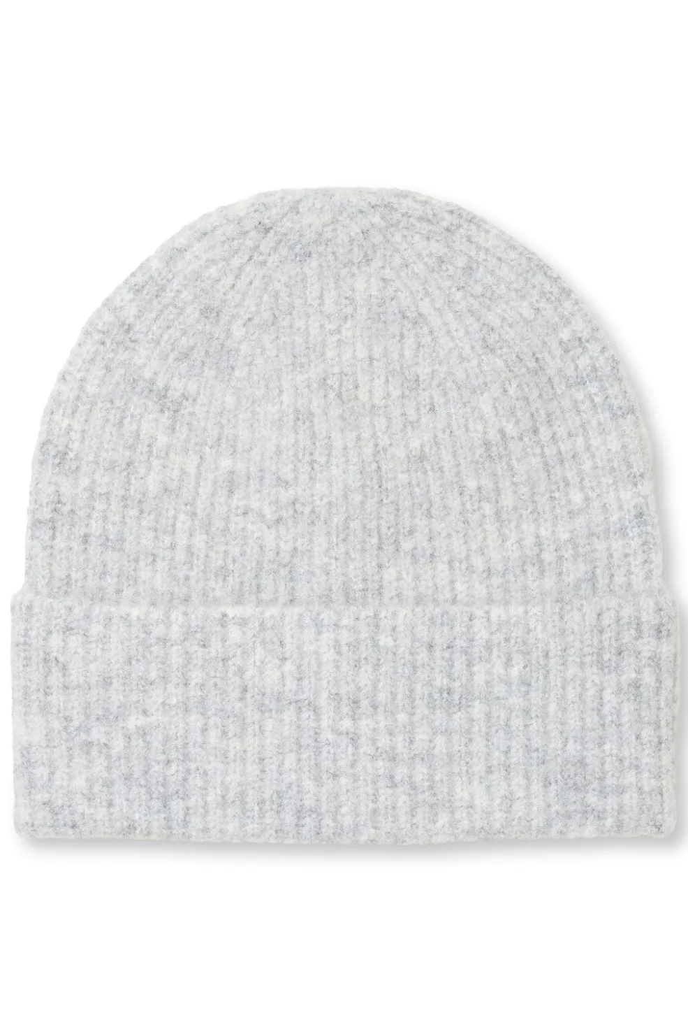 Lys grå meleret hue fra MbyM med ribbet tekstur og foldet kant. Huen er strikket i en blanding af syntetiske og naturlige fibre.
