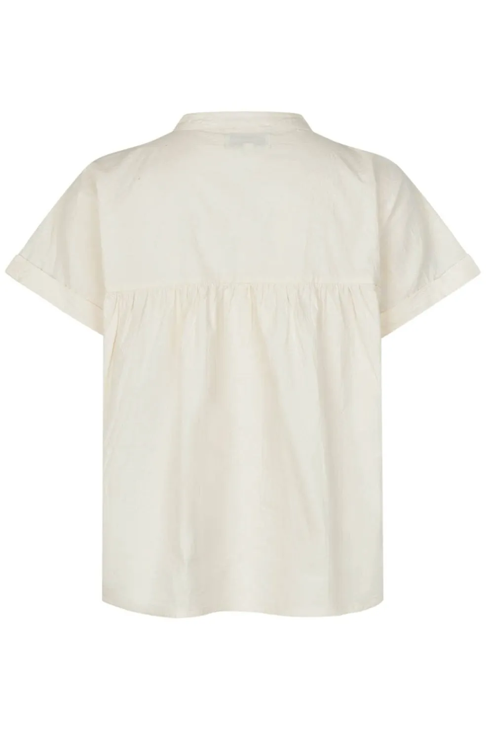 Cremehvid skjorte fra Lollys Laundry med håndlavet blomsterbroderi i lilla, blå og grønne nuancer. Skjorten har klassisk krave og knapper foran.