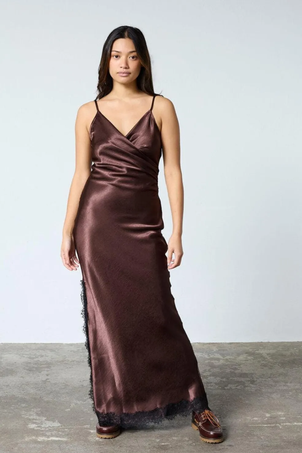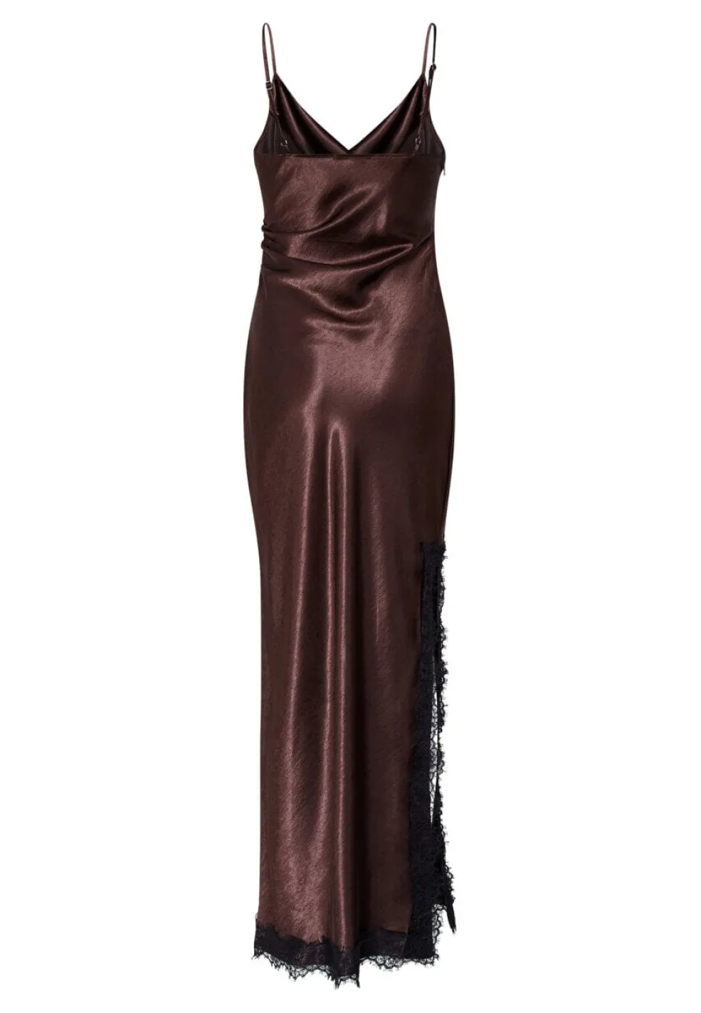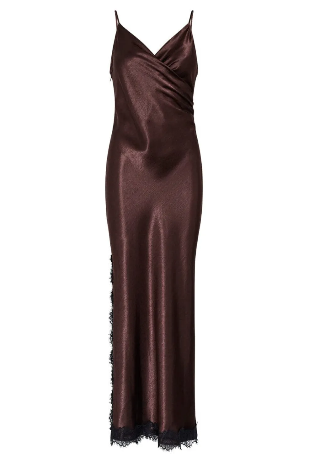 Kjole fra Sisters Point i brun og sort med skinnende satinfinish og sorte blondedetaljer langs kanten samt en sideslids.