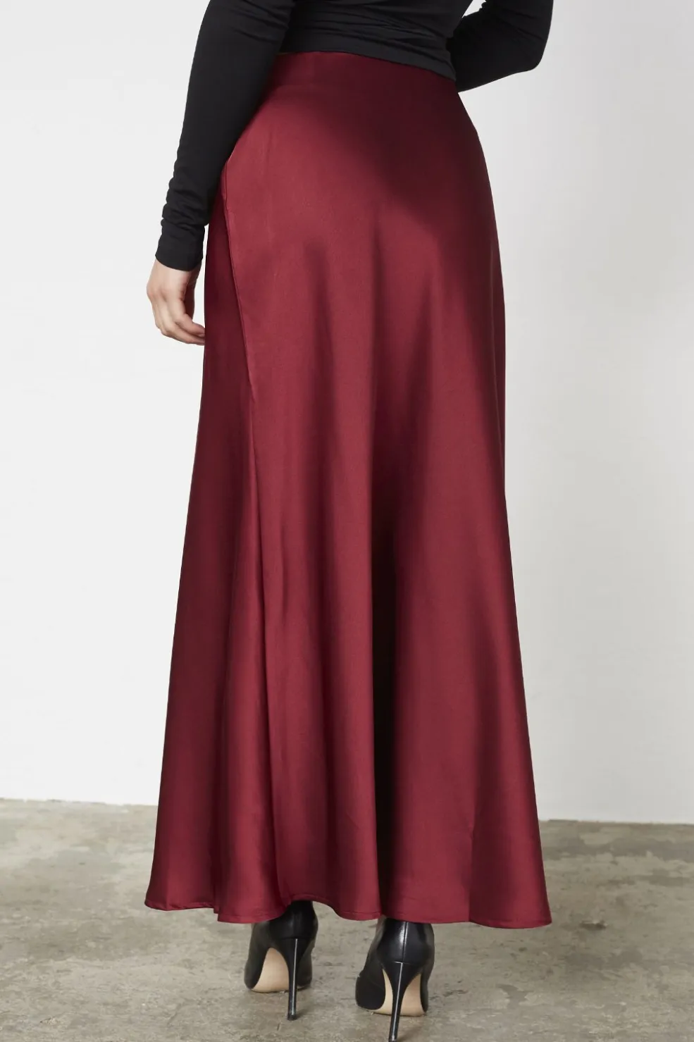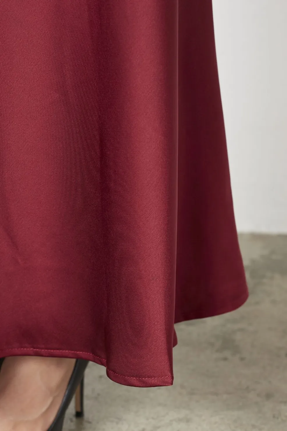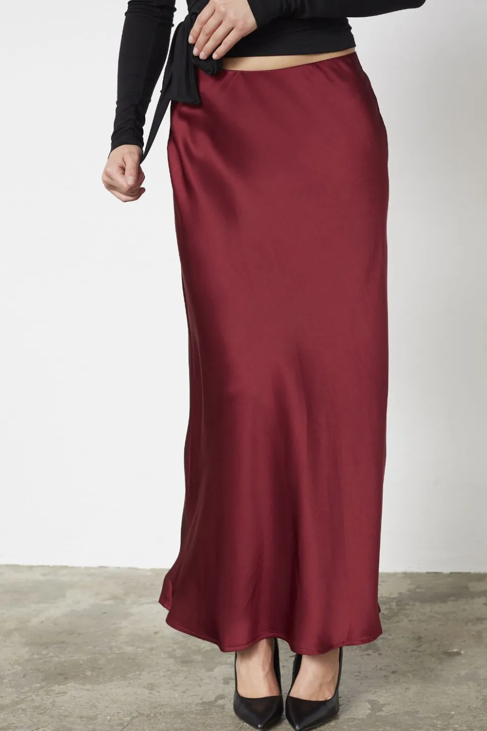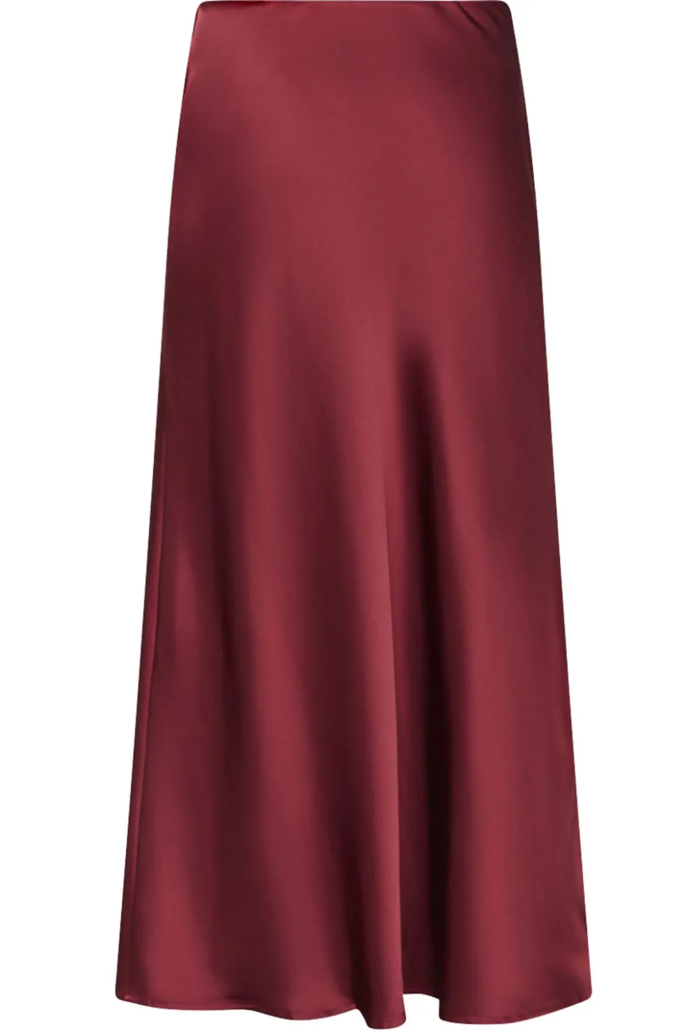 Lang nederdel fra Sisters Point i dyb rød bordeauxfarve. Lavet af ensfarvet satin med en løs pasform og elastik i taljen.