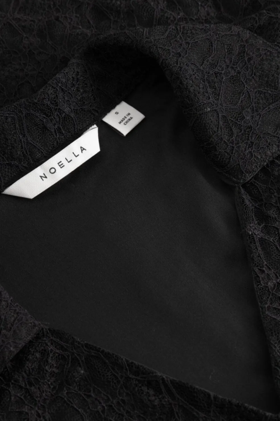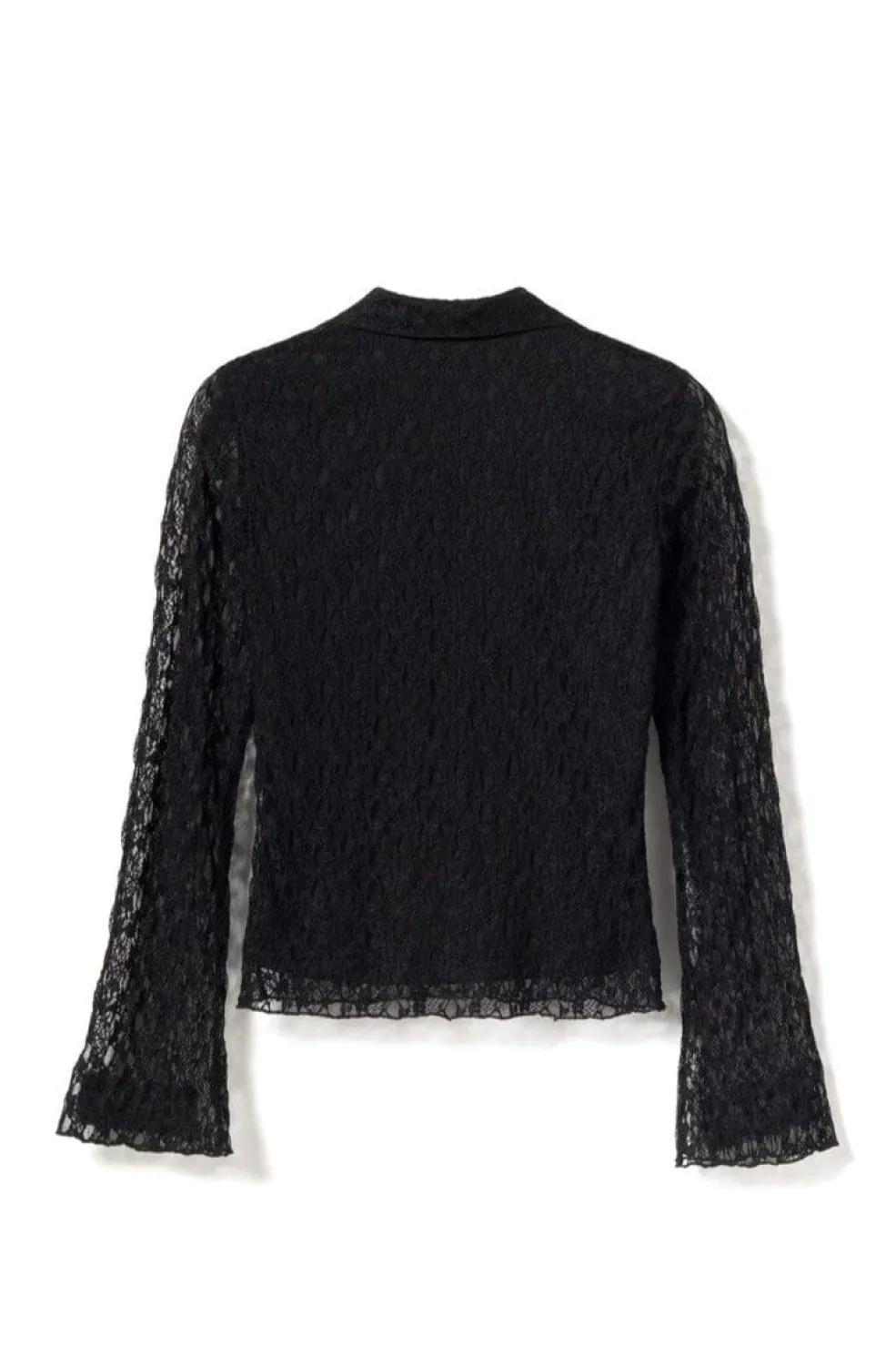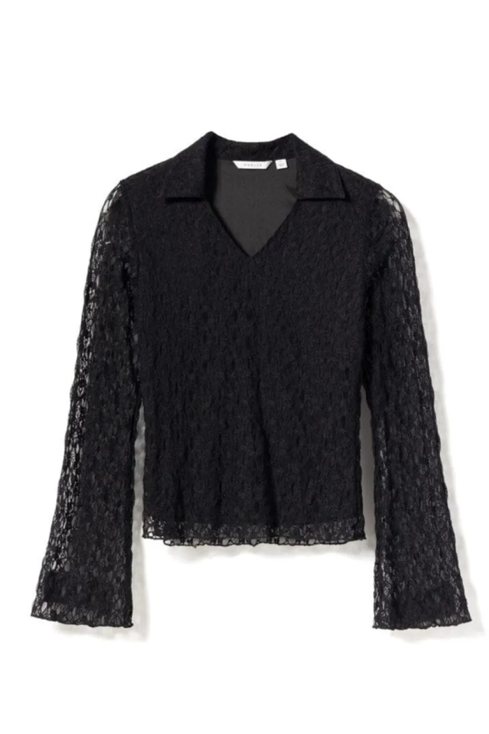 N-Latoyah Top er en kort, tætsiddende blondebluse med for i overdelen. Blusen har fine lange ærmer, en flatterende V-udskæring og en struktureret krave.