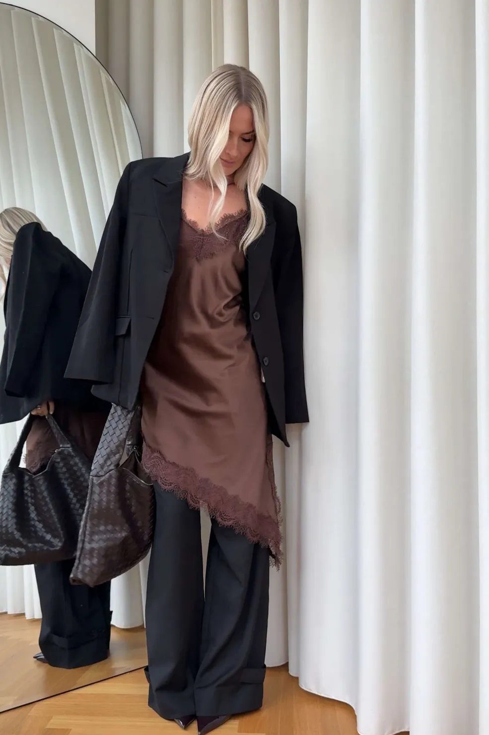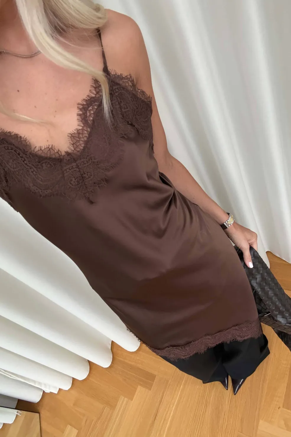 Brun satinkjole fra Noella med blonder ved halsudskæringen og kanten. Kjolen har justerbare, tynde stropper og en asymmetrisk kant.
