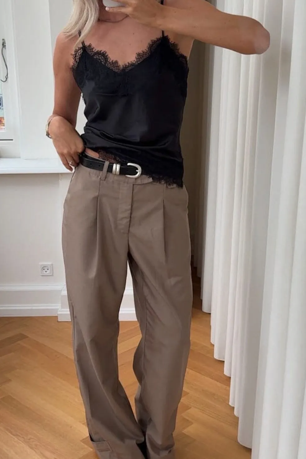 Sort satinbluse fra Noella med v-hals og blonder-detaljer langs udskæringen og kanten. Blusen har tynde stropper og en asymmetrisk kant.
