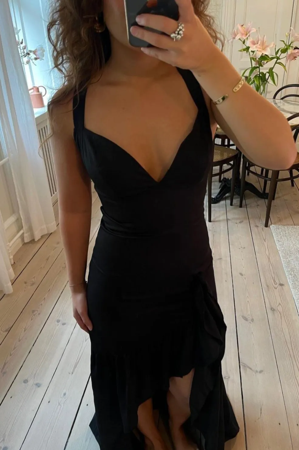 Sort kjole fra A-bee med gulvlængde og figursyet pasform. Kjolen har spaghettistropper, V-hals og flæser med bindedetaljer.