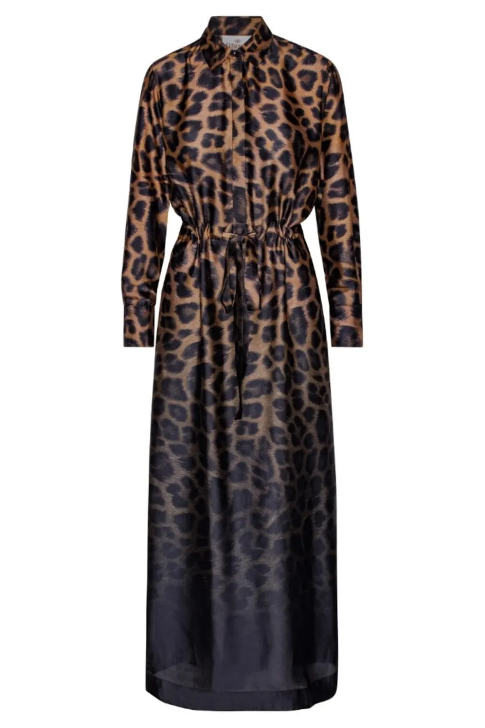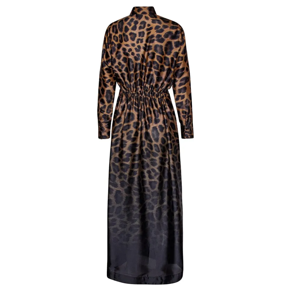 Ankellang kjole i gradient leopardmønster med skjortekrave og lange ærmer. Kjolen har et split-back design og bindebånd i taljen, der giver mulighed for at tilpasse pasformen.