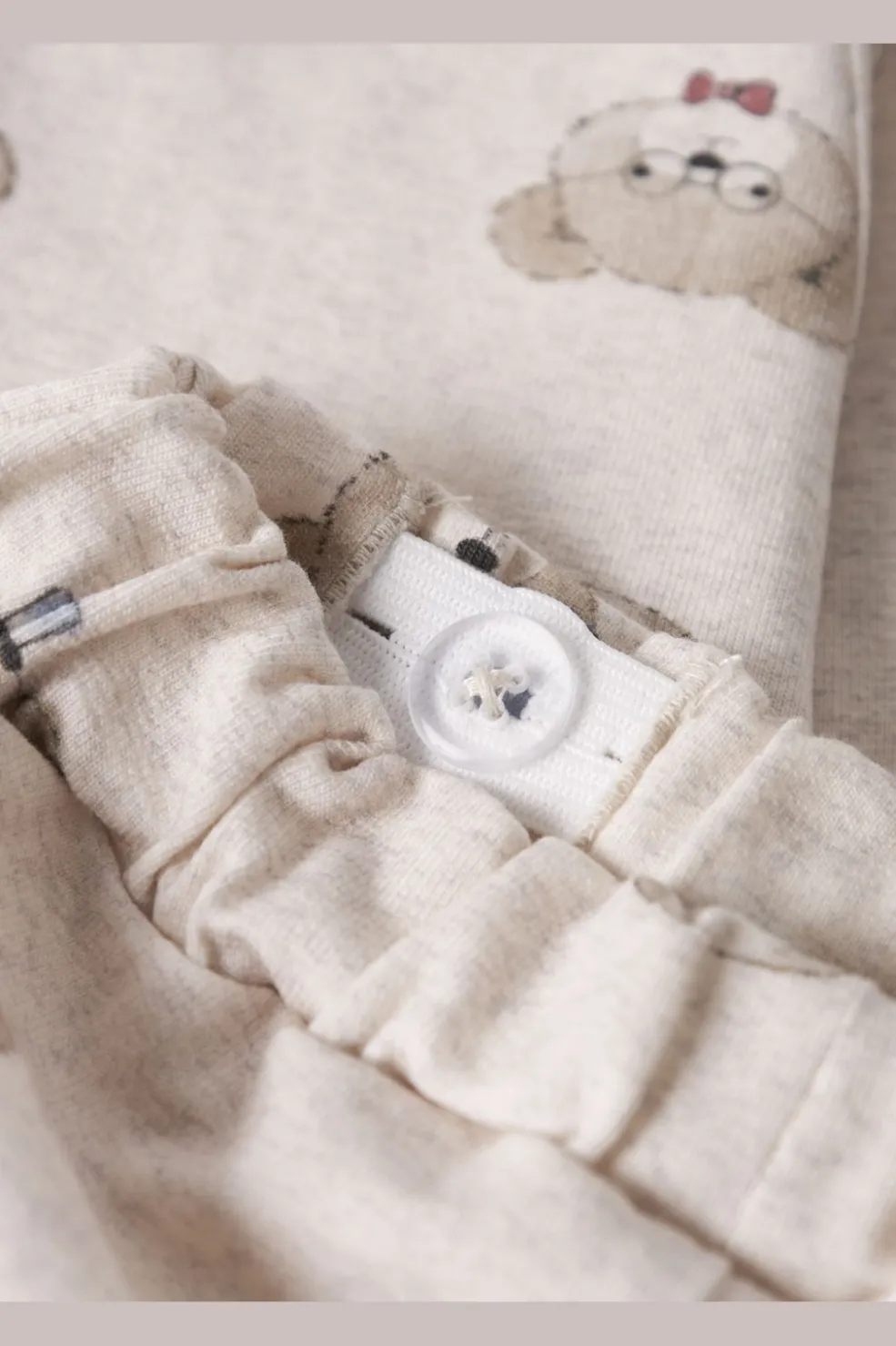 Beige bukser med bjørneprint fra Name It. Bukserne har et sødt mønster med små bjørne, der har hatte og sløjfer på en lys baggrund. De er lavet i en blød og behagelig kvalitet.