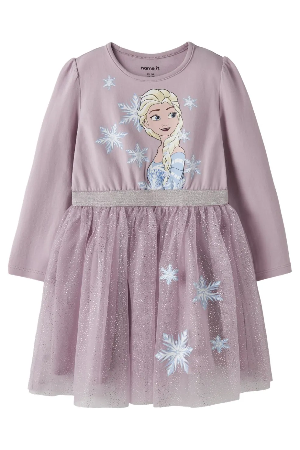 Lyserød kjole fra Name It med lange ærmer. Kjolen kombinerer en blød bomulds-overdel med et glimrende tylskørt og har et karaktertryk med snefnug på fronten.