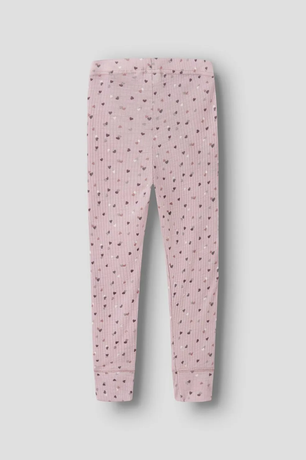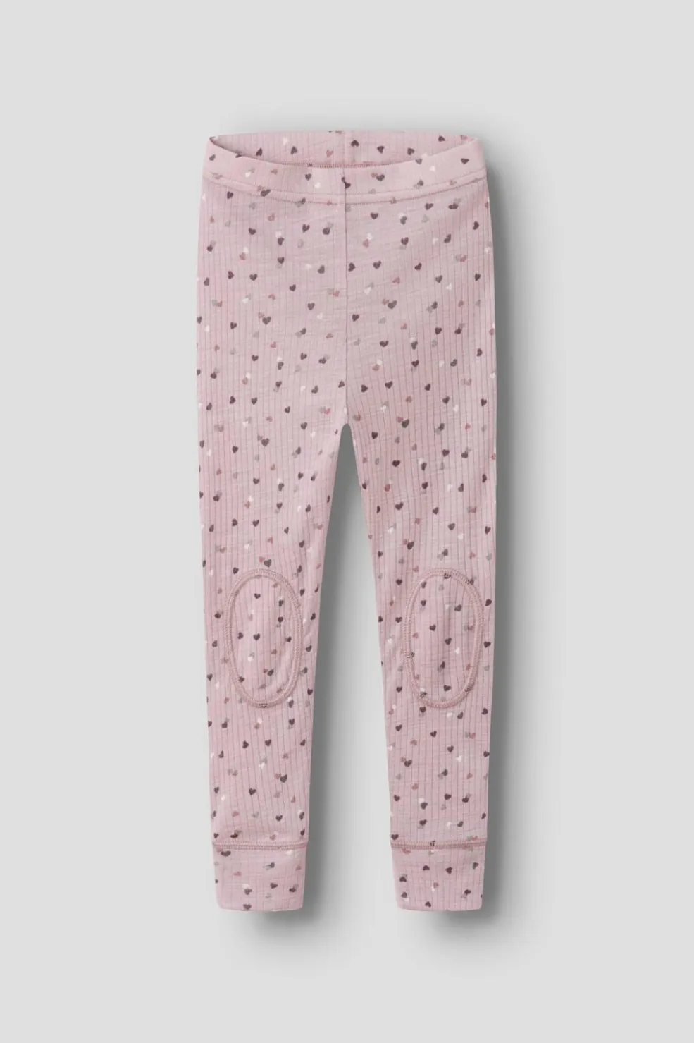 Grå leggings fra Name It med hjerteformet print. Fremstillet i en blanding af merinould og modal, der giver en blød og varm fornemmelse mod huden.