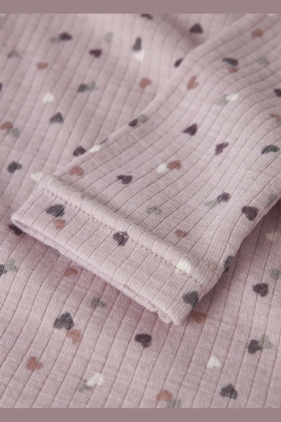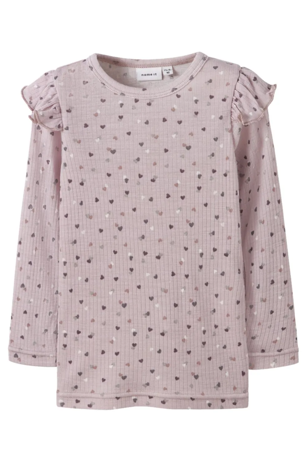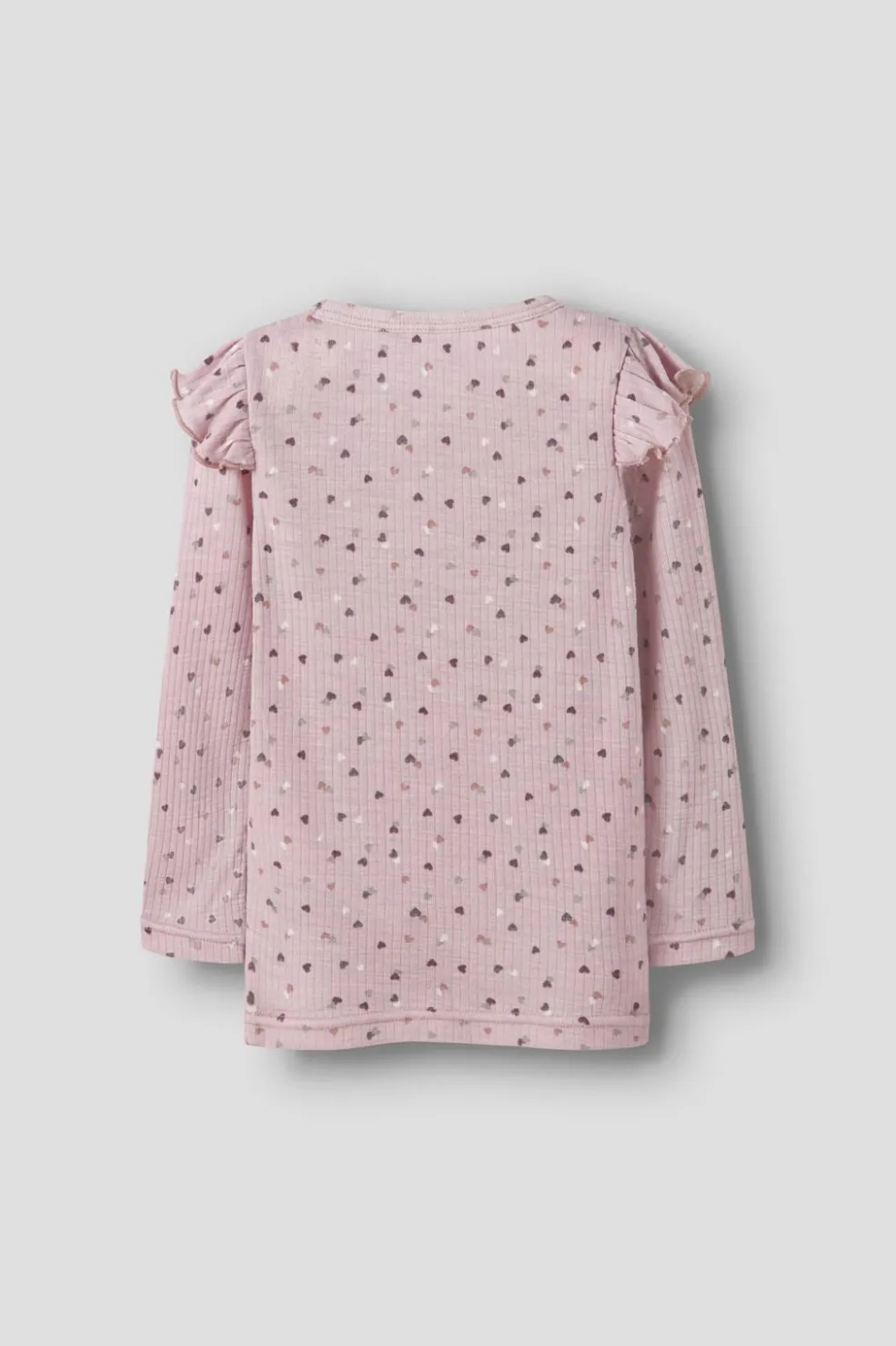 Langærmet top fra Name It i en lyserød nuance med hjerteprint og flæsedetaljer. Toppen har en ribbet stofstruktur og rynkede flæser på skuldrene.