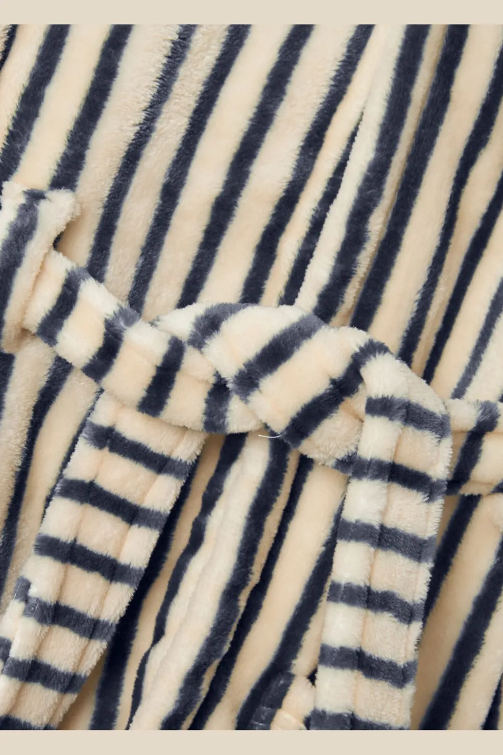 Stribet morgenkåbe fra Name It i mørk safir og cremefarvet fleece. Knælang model med hætte, to forlommer og et aftageligt bælte til at justere pasformen.