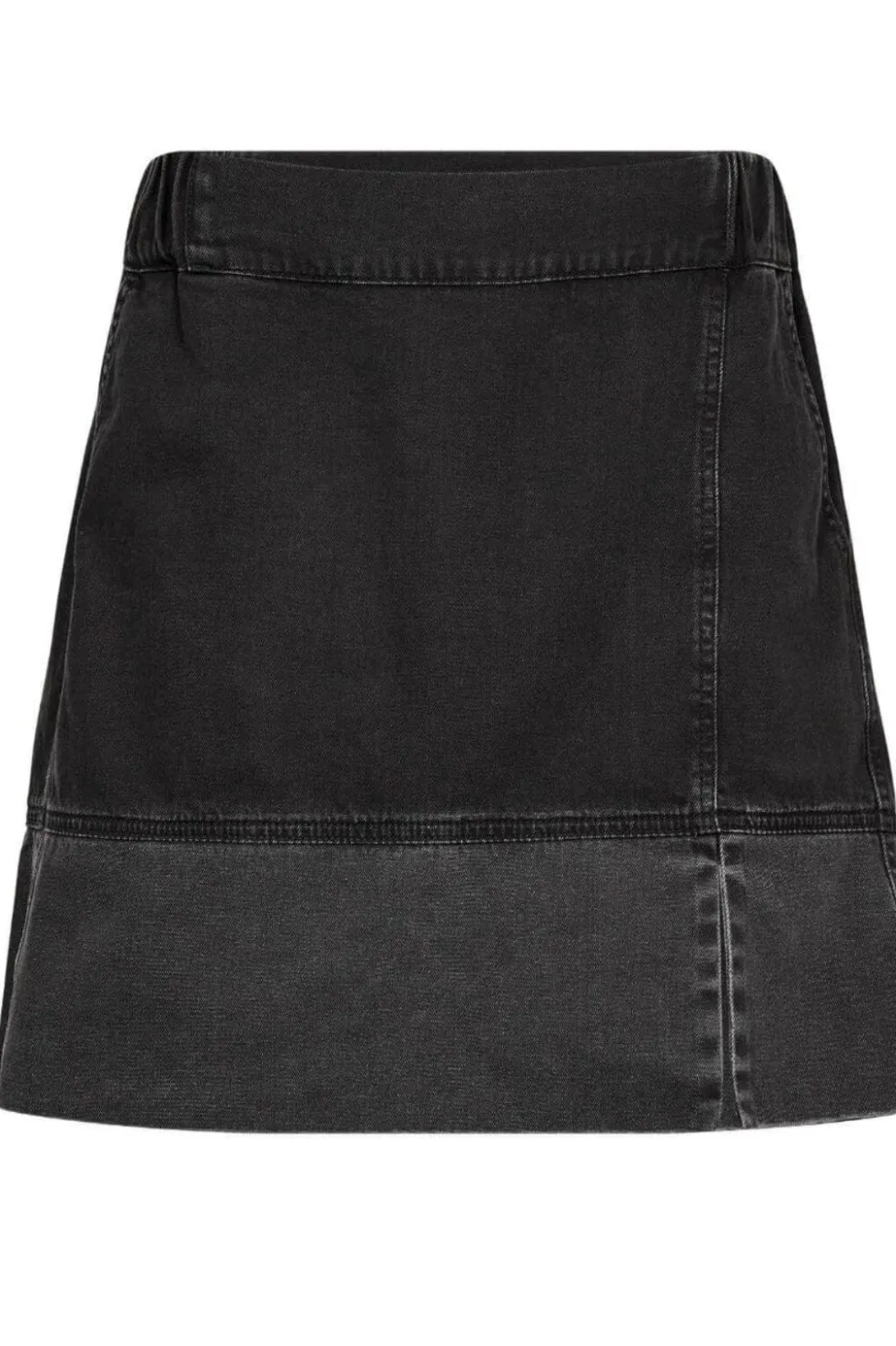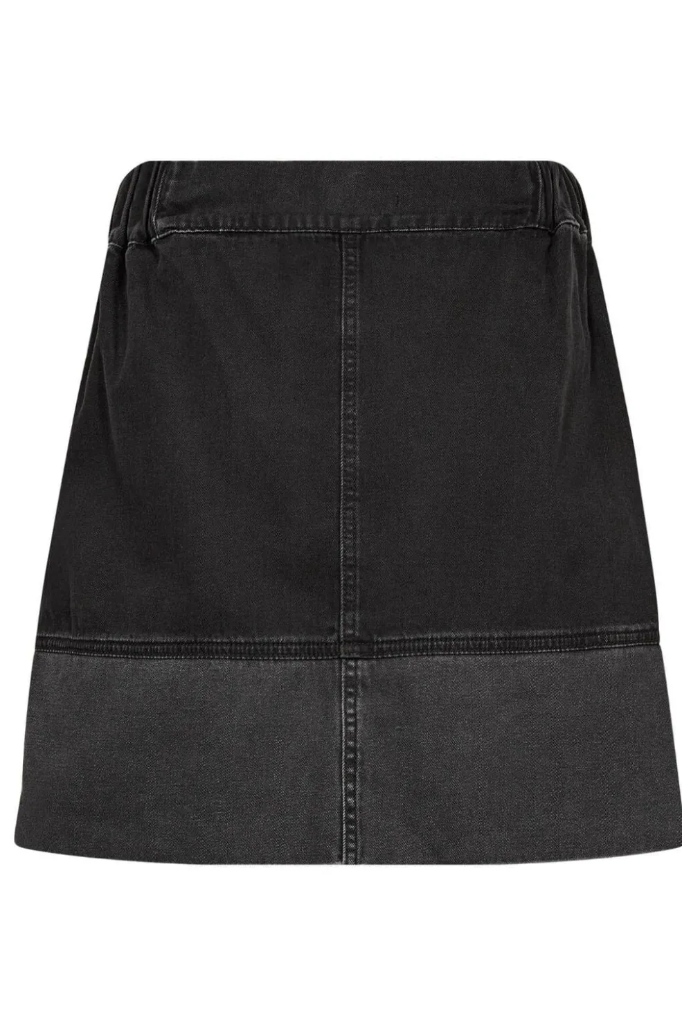 Sort denimnederdel fra Gossia med to-tonet design og slids i bunden. Nederdelen har en elastisk talje og et afslappet udtryk med dekorative syninger.