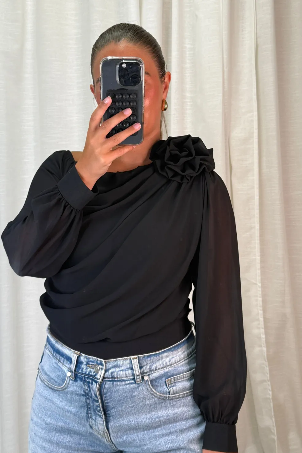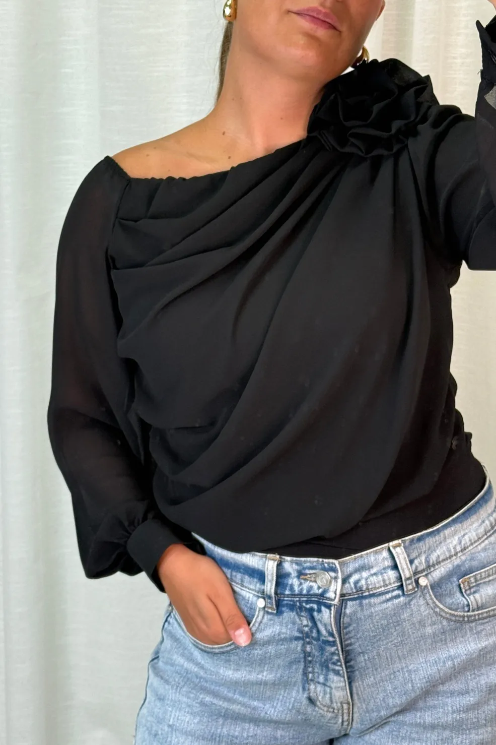 Sort bodystocking fra A-bee med asymmetrisk halsudskæring og draperinger. Den passer til formelle begivenheder og festlige lejligheder.