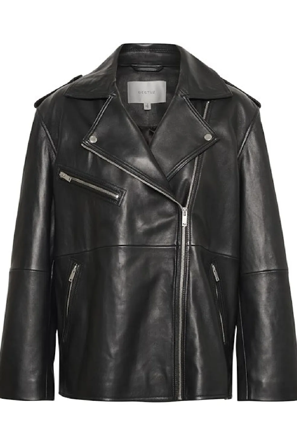 Sort læderjakke fra Gestuz med bikerstil-design. Jakken har skjortekrave, lynlåslukning og flere lommer på fronten. De dekorative syninger giver jakken et råt udtryk.