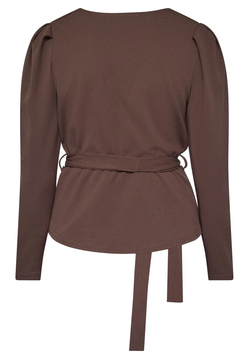 Brun bluse fra Sisters Point med wrap-design og bælte i taljen. Blusen har en dyb V-hals og lange ærmer med let puffede skuldre.