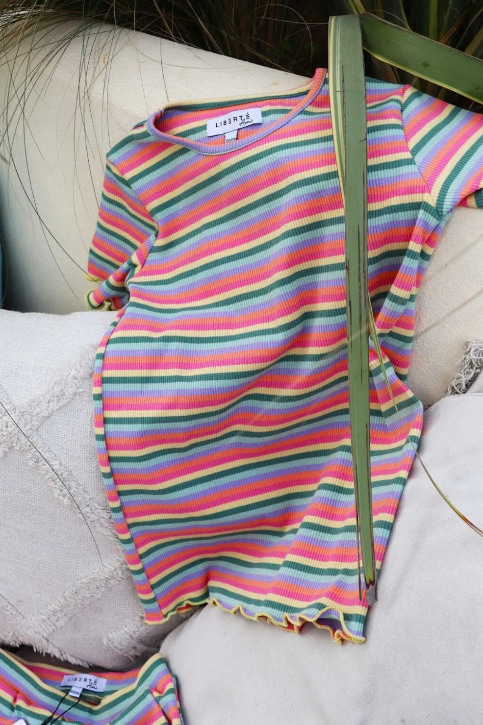 Stribet bluse fra Liberte Ami i ribbet stof med flerfarvede striber i orange, pink, grøn og blå. Den har korte ærmer med flæsekanter og en rund halsudskæring.