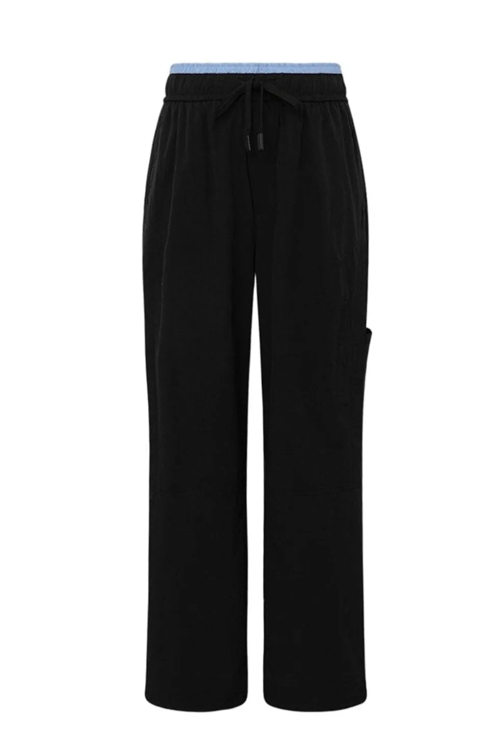 Sorte track pants fra Gossia med løs pasform. Bukserne har en bred benudskæring og en elastisk talje med snøre. Sidelommer og en lyseblå kontrastkant i taljen giver bukserne et sporty præg.