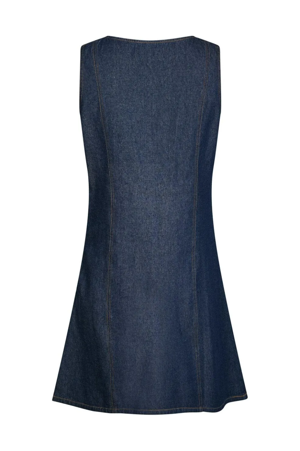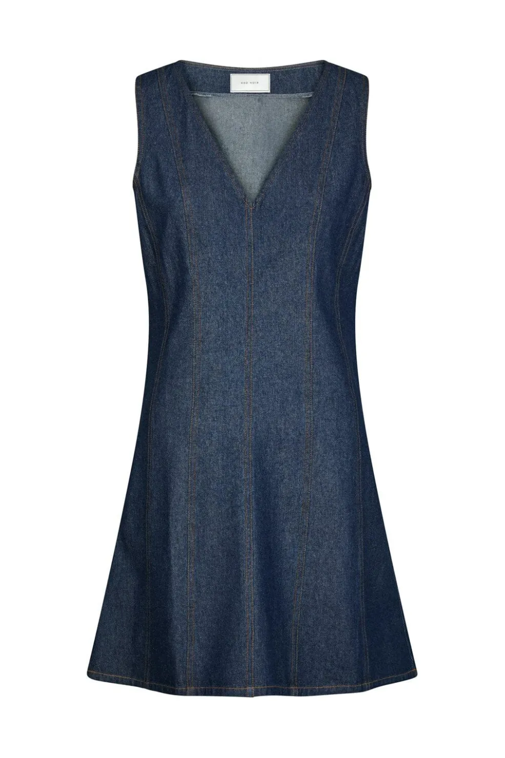 Mørkeblå denimkjole fra Neo Noir med A-linje-silhuet. Kjolen har V-hals og ærmeløst design med synlige kontrastsyninger, der fremhæver A-linjen.